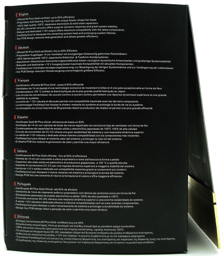 Ambos laterales hacen la misma descripción de las características más relevantes de la fuente, ya citadas anteriormente. Esta vez, se emplean hasta un total de 13 idiomas, para ayudar al usuario en la comprensión del producto, sin discriminar la ubicación territorial del mismo.