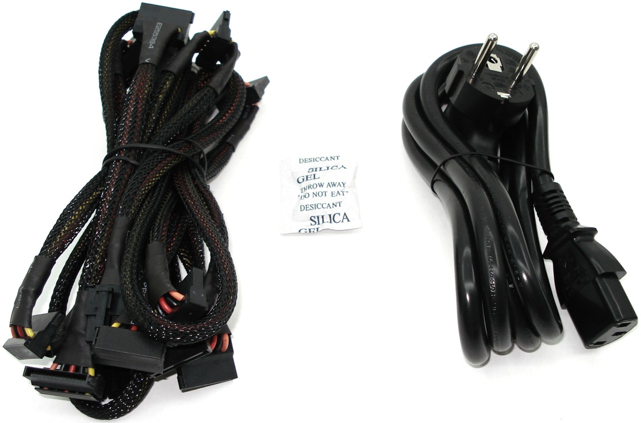 Especial mención merece el cable de alimentación de corriente alterna (CA), de muy buena calidad y de gran grosor, garantizando la alimentación de corriente a través de él para la fuente de gran potencia. Este cable se presenta separado y tiene una longitud de 150cm. Además, en el interior de una simple bolsa, se adjuntan 3 cableados modulares con conectores SATA. La bolsa de silica, se presenta suelta en el interior de la caja, para garantizar que no se generen condensaciones en el interior de la misma, evitando así humedades, conservando todos los componentes del interior de la caja de cartón en buen estado.