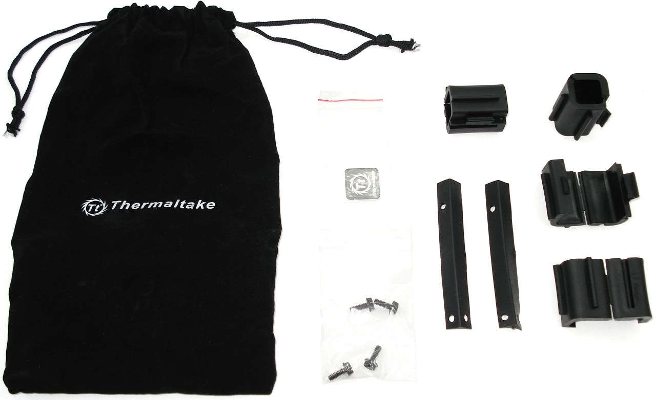 Este es todo un detalle por parte de Thermaltake. Muchos productos que se lanzan a la venta , incluso de gama alta, vienen con lo justo y necesario. Pero lo cierto es que éste en concreto tiene unos extras bastante aceptables viniendo de una fuente de alimentación de este calibre. Dentro de una bonita bolsa negra con cierre de cuerda, nos encontramos con 4 tornillos de montaje, 2 gomas antivibraciones para su montaje, una pequeña y resistente chapa metálica con el logo Tt de Thermaltake y 4 abrazaderas de plástico ABS para fijar cables.