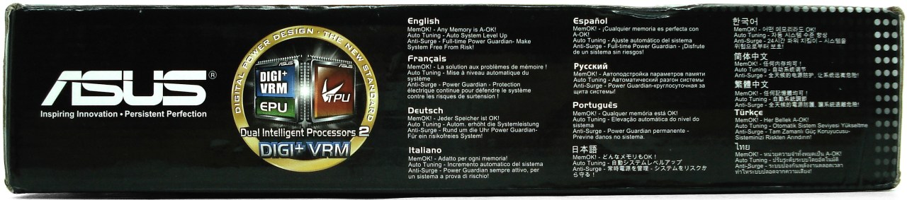 El resto de laterales es muy similar, e indican prácticamente lo mismo, con excepción del lateral trasero, donde curiosamente se resalta en hasta 13 idiomas, la función MemOK! de Asus para Auto Tuning. La veremos con detalle.