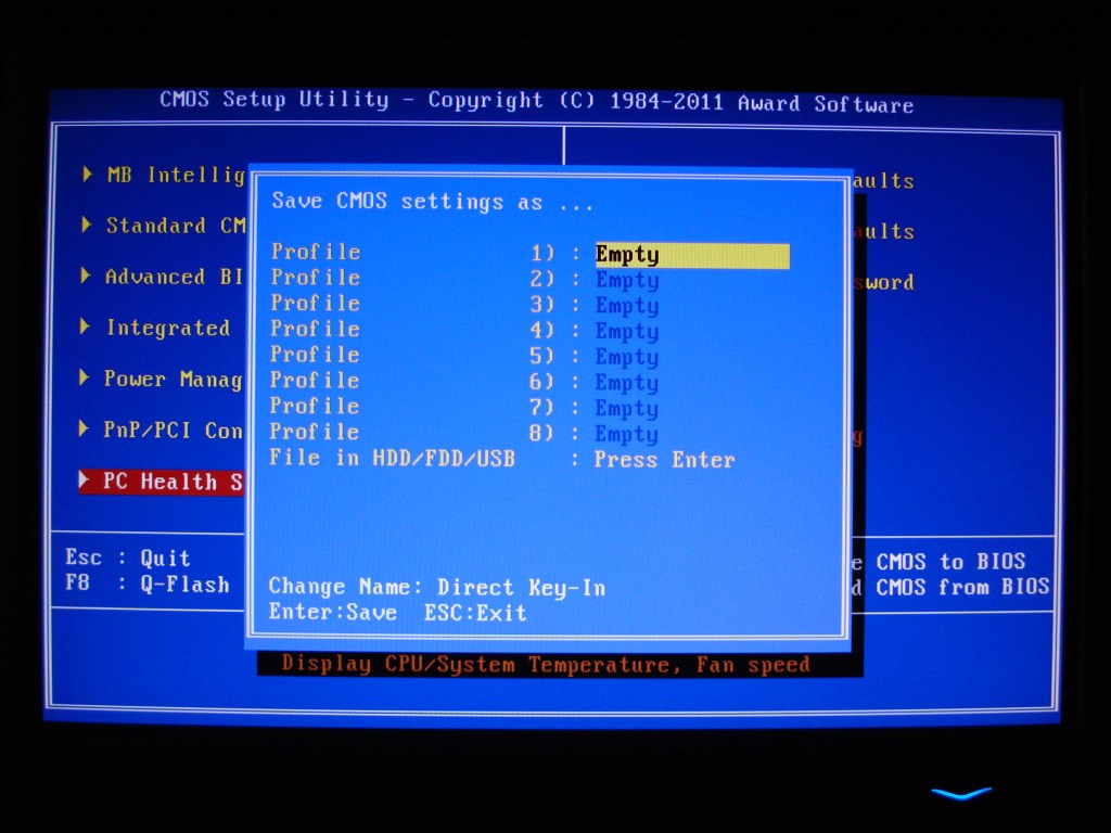 GIGABYTE GA-Z68X-UD4-B3. Award BIOS versión E1 (F9B). Save CMOS Settings as… (Tecla F12)