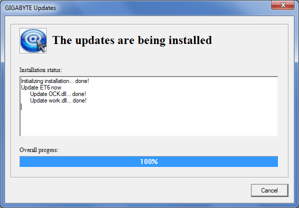 Siempre que instalamos un programa nuevo, solemos comprobar si tiene alguna actualización disponible online. Así que, tras instalar el programa EasyTune6 y tras el reinicio obligado, pinchamos otra vez en el icono «@» de la utilidad para realizar tal comprobación. Y efectivamente, vemos como Gigabyte hace sus deberes dando soporte continuado a su software, con el resultado de una actualización de varias librerías .dll que acompañan al propio ejecutable de la utilidad. Tras otro reinicio del S.O. obligado, ya podemos manejar la utilidad con toda solvencia.