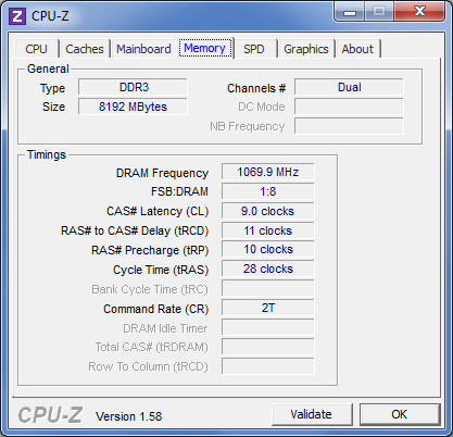 GIGABYTE GA-Z68X-UD4-B3. Programa CPU-Z. Sección Memory