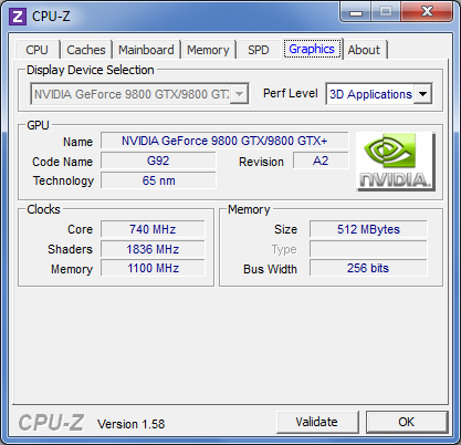 GIGABYTE GA-Z68X-UD4-B3. Programa CPU-Z. Sección Graphics. Zotac NVIDIA GeForce 9800GTX+ / Current