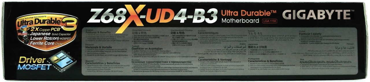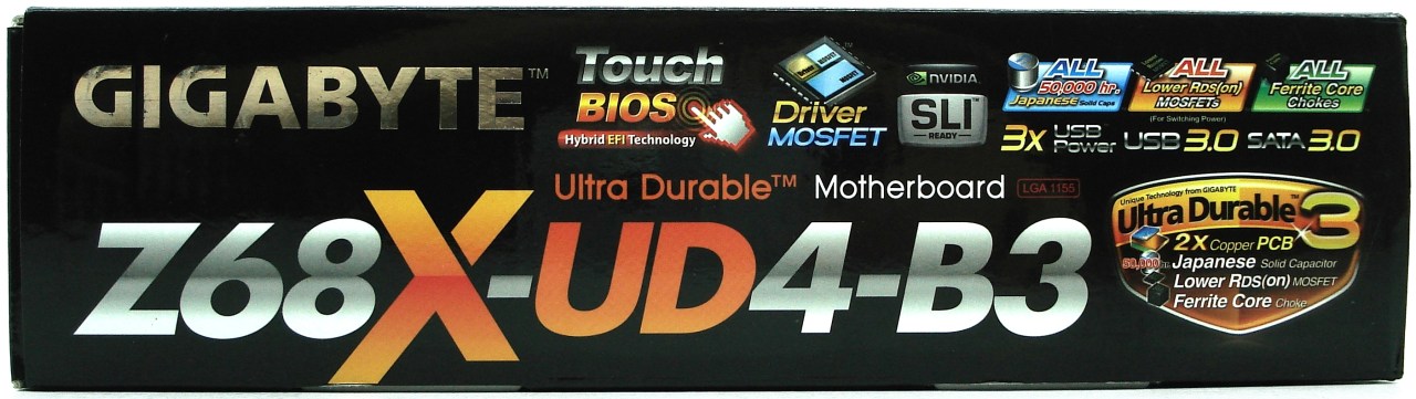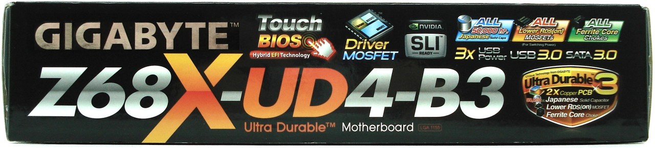 Para empezar, tanto en la parte superior como en la inferior del embalaje, está repleto de información referida a las características de la placa base, ya citadas en la página 2 de este mismo análisis, y remarcadas con diferentes logos y descripciones, únicamente en el idioma inglés. En realidad cuesta lo suyo leerse todo lo que nos dice la caja, no por la dificultad, sino por la cantidad. Si nos fijamos bien, Gigabyte nos bombardea con información en todas las caras del embalaje, donde se destaca la conocida tecnología Ultra Durable 3 de Gigabyte, con 3 características para mayor rendimiento y durabilidad en electrónica: condensadores sólidos japoneses de mayor durabilidad, mejora en la resistencia de paso por la doble capa de cobre de doble grosor implementada, uso de drivers Mosfet para mejora en la demanda de energía VRM para la CPU, así como componentes Choque con núcleos de ferrita para mayor eficiencia energética y en conjunto disminuir la temperatura generada. Además, se destaca la nueva incorporación del software bajo Microsoft Windows como una alternativa más para manejar la BIOS, con «Touch BIOS» (Tecnología Híbrida EFI), compatible con pantallas táctiles. Si eso parece poco, cabe destacar el denominado «333 Onboard Acceleration» de Gigabyte, con puertos USB 3.0, SATA 3.0 y USB power 3x, con puertos USB On/Off Change, así como soporte para doble tarjeta gráfica ATI Crossfire o NVIDIA SLI y Dual BIOS de Gigabyte. Por último, el socket Intel 1155 viene reforzado con 16 fases de energía con abastecimiento dual, controlable bajo software. El resto de características del equipamiento de esta placa base las seguiremos viendo a lo largo de este análisis.