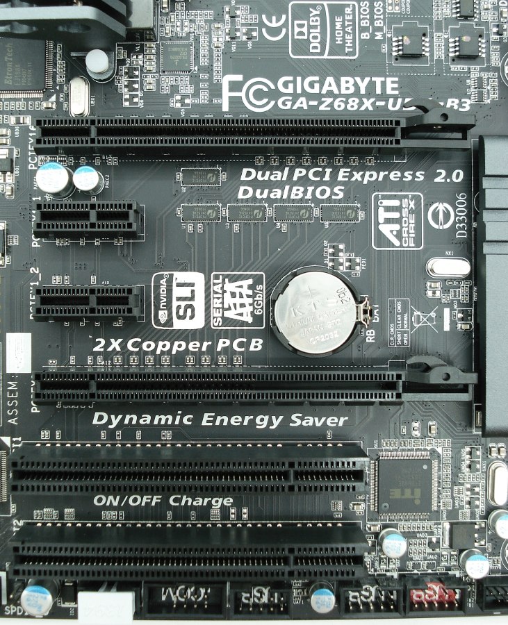 En general, el reparto de los slots PCI y PCIe está bastante bien pensado para tener siempre al menos un slot PCIe x1 (siempre y cuando la tarjeta gráfica dedicada no ocupe 3 slots, cosa que nos parece una barbaridad) y otro 1 PCI libre, tanto si usamos una sola tarjeta gráfica que ocupe 2 ranuras (slot superior) como si usamos 2 en SLI o CrossfireX (slots PCIe más largos, ambos, x8 + x8). Así, tenemos 3 slots a pares, 2 PCIe x16 y x8, 2 slots PCIe x1 y 2 slots PCI, todos de color negro. Los slots PCIe son todos compatibles con el estándar 2.0, y que pronto serán compatibles con el estándar 3.0, únicamente actualizando la última BIOS que proporcionará Gigabyte en breve. Así en total, dispondremos hasta de 6 slots, 1 menos de los que cabría esperar, al menos 7.