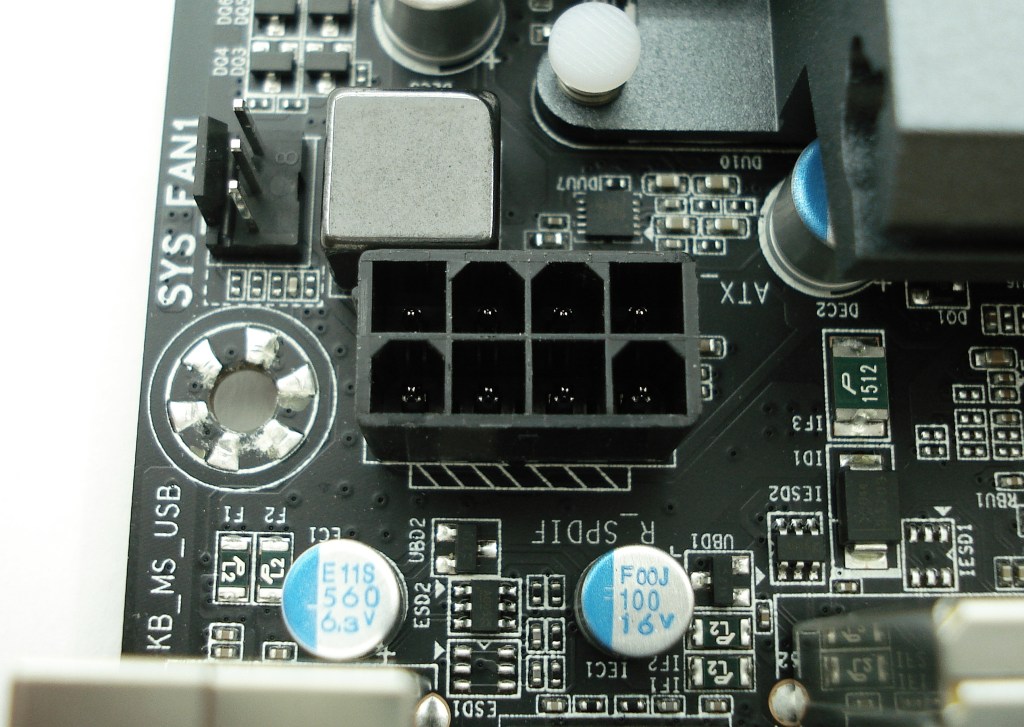 Los conectores de alimentación son los típicos para abastecer a la placa base y al socket de energía de corriente continua. Por un lado, tenemos el conector de 24 pines habitual, colocado a mediana altura. Esta vez, Gigabyte se ha preocupado por colocar correctamente el conector de 8 pines EATX12V que refuerza la alimentación para la CPU, situándolo en la parte más superior, para tener mejor acceso para la conexión bordeando el cableado por arriba.