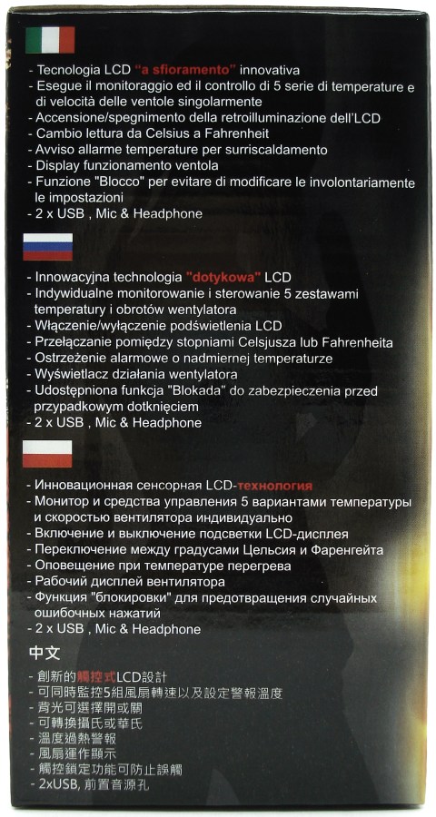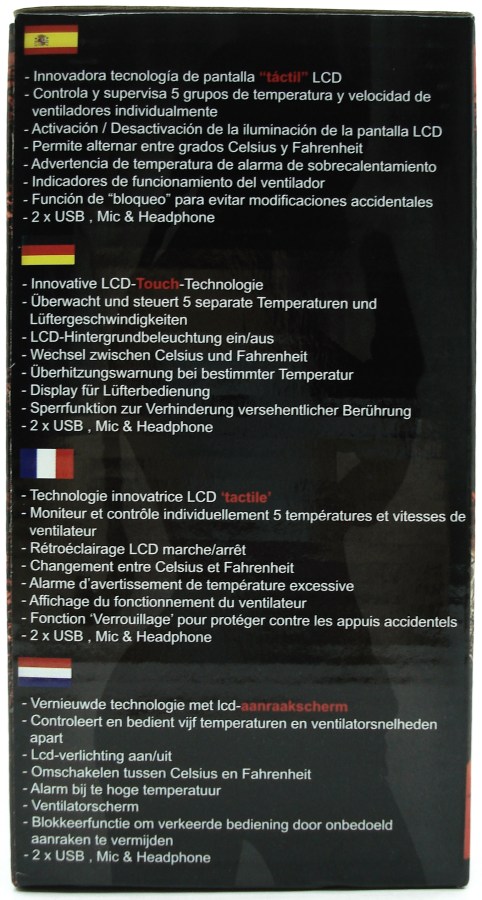 El resto de caras nos aportan mayor información en hasta 8 idiomas, entre ellos el español. Lo más destacado es su carácter totalmente táctil, con una pantalla LCD de elevado contraste. Con ella tendremos bajo control la temperatura de 5 dispositivos, además de controlar 5 canales con un rango aproximado del 50%, dependiendo de la velocidad de giro de cada ventilador instalado. Con hasta 8W por canal, podremos controlar hasta 10 ventiladores por parejas, siempre y cuando no superen los 4W cada uno. Las alarmas de funcionamiento, fallos y elevada temperatura, el encendido y apagado del panel, así como su conectividad extra, hacen de él un panel un componente muy completo para nuestra torre gamer.