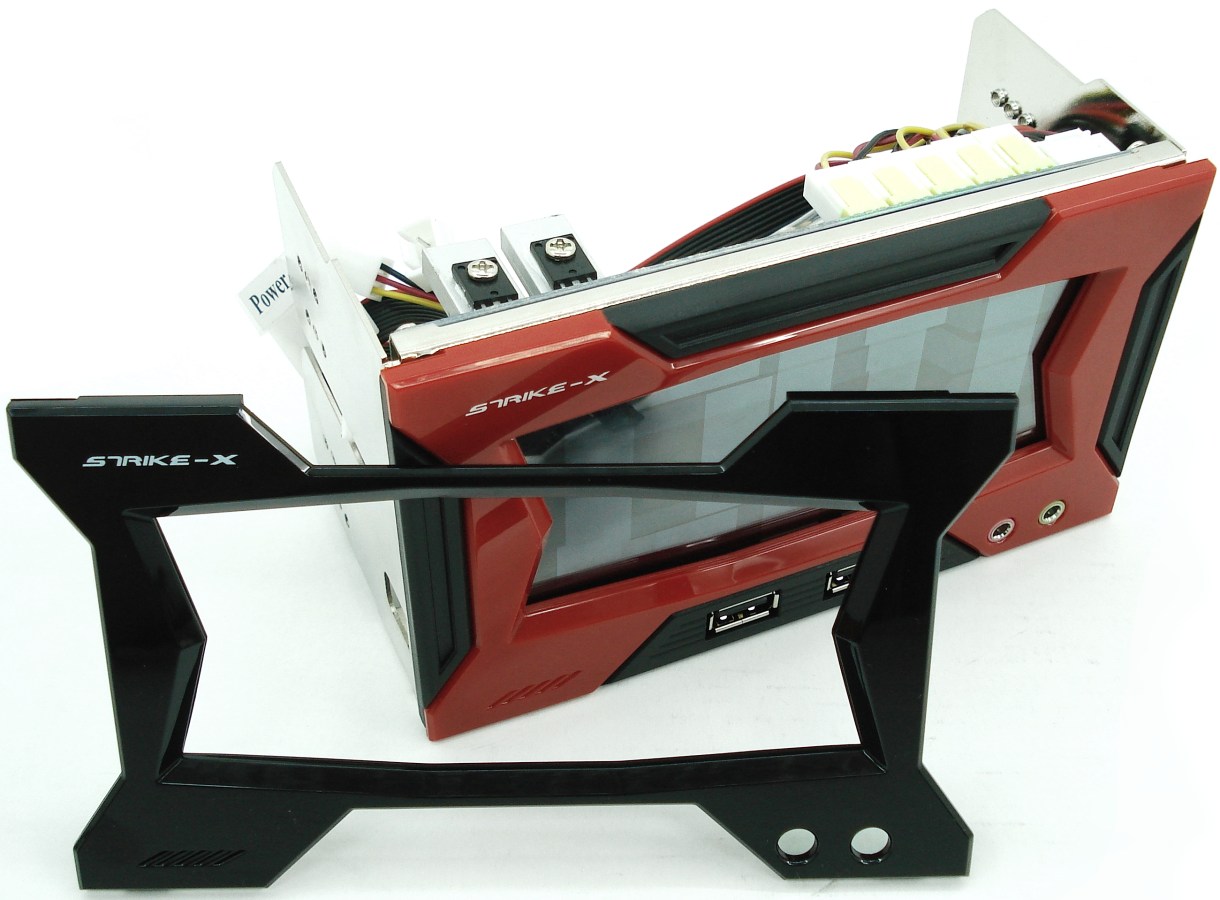 La carcasa frontal intercambiable refleja directamente el motivo o símbolo principal de la Serie Strike-X, esa «X» estirada que encierra el panel donde apuntamos con nuestra mirada. Tiene este tamaño por las dimensiones de doble bahía de 5.25″ así que esto resultará una ventaja y otra desventaja. Desgraciadamente en muchas ocasiones, lo que sirve mejor para una cosa, entorpece para otra. Este tema lo veremos más adelante.