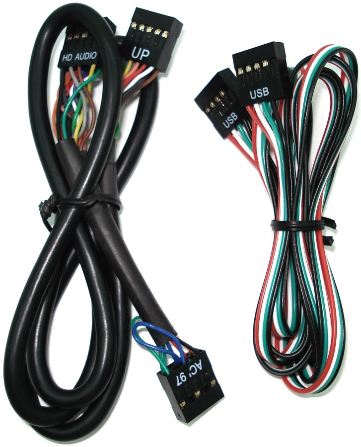 El cableado correspondiente al audio posee una entrada de conexión «UP» y 2 salidas de conexión AC’ 97 y HD Audio para conectar directamente a la placa base del PC. Este cableado viene debidamente protegido hasta los extremos y sirve para dar funcionalidad al micrófono y auriculares que podremos conectar a través de él. A parte, disponemos del cableado para conectar 2 dispositivos USB 2.0. Como ya sabéis, este cableado transfiere datos y una tensión de 5V de tensión con baja intensidad de corriente.