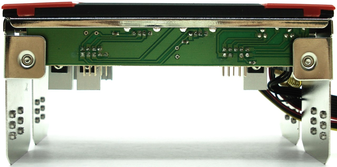 Otra de las características de este panel es la amplia compatibilidad con las cajas para PC del mercado. Posee 6 perforaciones de atornillado en cada uno de los laterales y en las 2 alturas de cada bahía de 5.25″, sumando un total de 24 perforaciones. Si la caja donde se monte nos lo permite, la mejor forma de fijarla es atornillando los tornillos a tres bolillo. Si no es así, optaremos por montarla eligiendo una hilera continua en vertical.