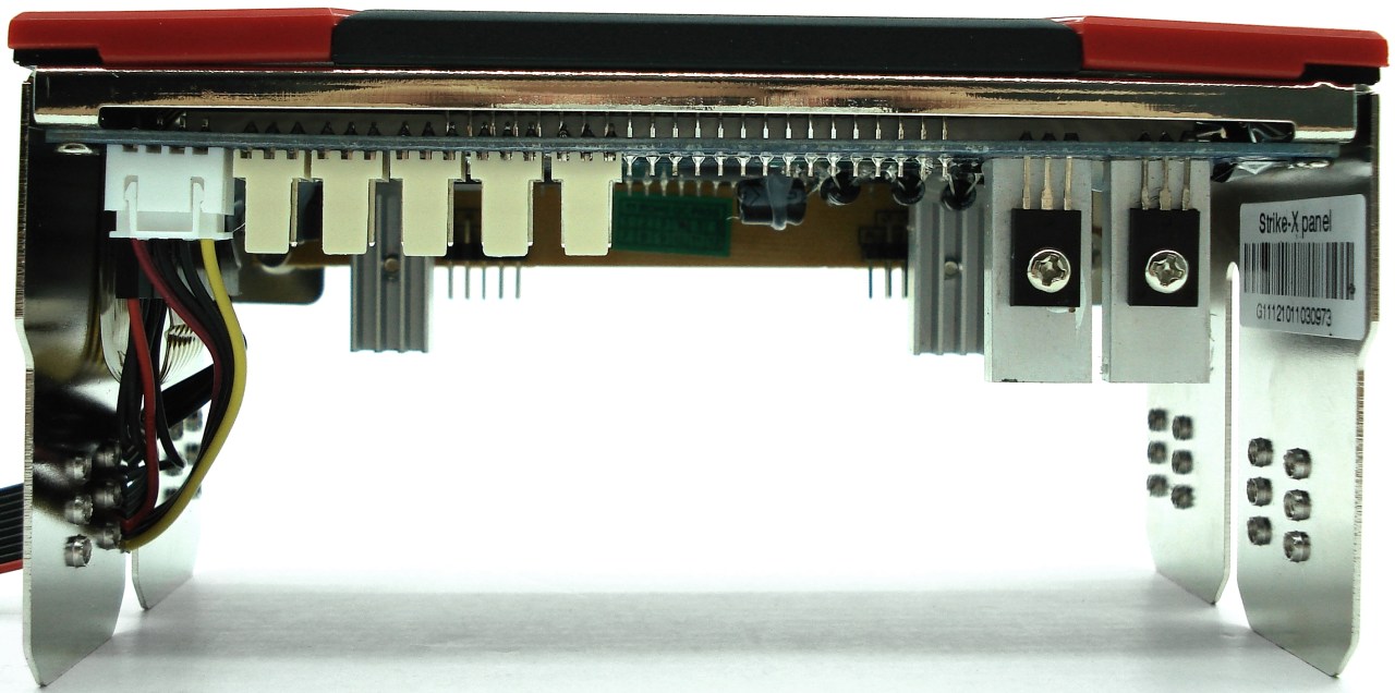 El Strike-X Panel está formado por un frontal envolvente totalmente de plástico ABS resistente de color negro mate, combinado con una carcasa fácilmente extraíble en color rojo brillo, superpuesta sobre un marco y cuerpo completamente de acero inoxidable, para otorgarle al conjunto mayor resistencia. Como es de esperar, toda la placa base electrónica, está montada y atornillada sobre este cuerpo de acero.