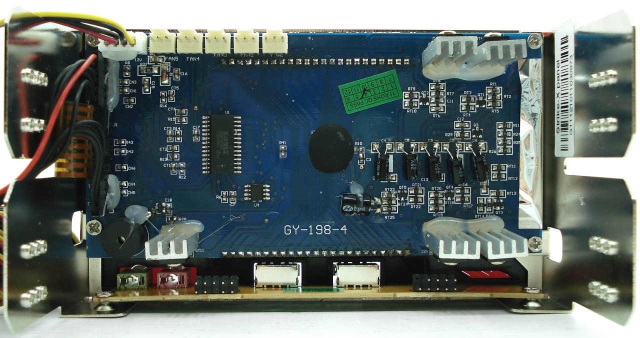 Para empezar, toda la circuitería electrónica circula a través de dos placas electrónicas de circuito impreso, una (la principal y más grande) colocada en vertical justo detrás del panel táctil delantero. La otra placa está colocada en horizontal y separada de la anterior, como base a las entradas y salidas USB 2.0 y Audio. Así, tenemos un 2 en uno; panel táctil controlador de RPM y temperaturas y panel frontal de conexiones básico. Lo cierto es que la mayoría de cajas para PC en la actualidad ya disponen de este extra de conectividad USB y de audio, pero si cabe, mejor traerlo que no. La placa grande vertical está atornillada en sus 4 puntas, mientras que la inferior está fijada por delante y atornillada con 2 tornillos en esquina por detrás. Esta 2 placas no tienen ninguna forma de comunicarse (la inferior no necesita alimentación alguna, ya que únicamente se conecta al cableado USB y de audio).
