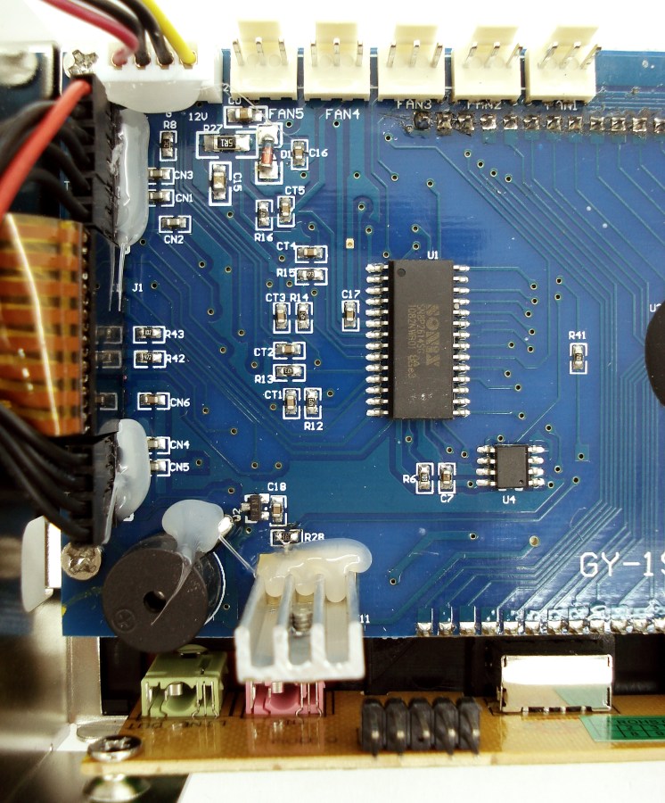 5. AEROCOOL STRIKE-X PANEL. Detalles I. Reparto y Electrónica I. Transistores. Disipadores. Altavoz. Conectores USB y Audio