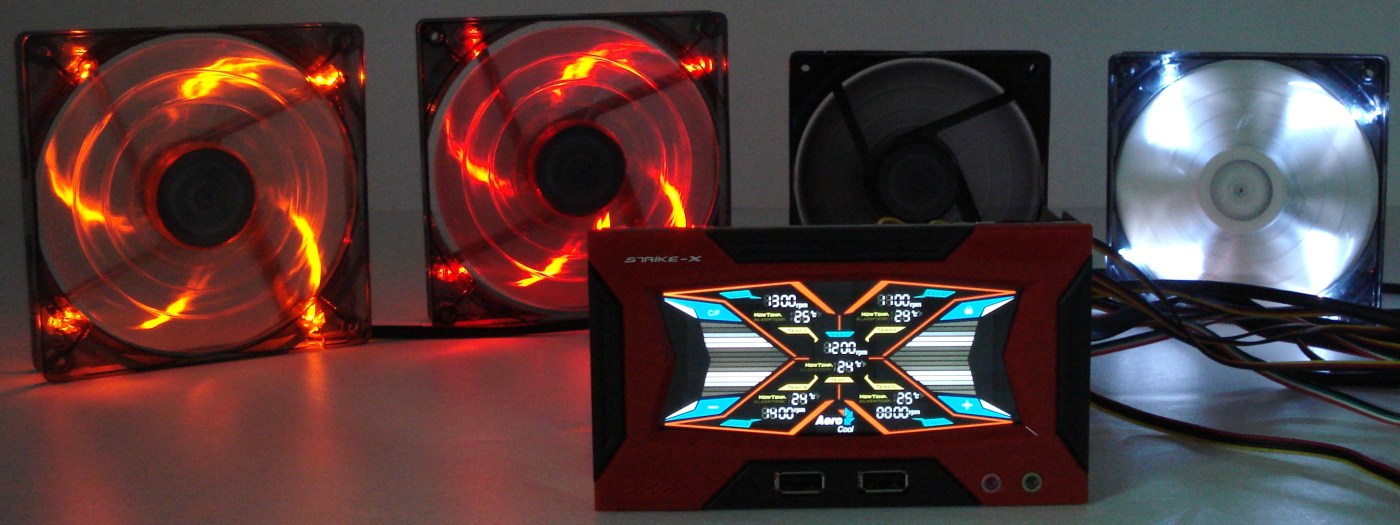 Para nuestras pruebas de funcionamiento, hemos optado por manejar el Strike-X Panel pelado, con 4 ventiladores conectados, dejando 1 canal RPM libre ; 3 Aerocool Shark y 1 Tacens Ventus II (de izquierda a derecha):
