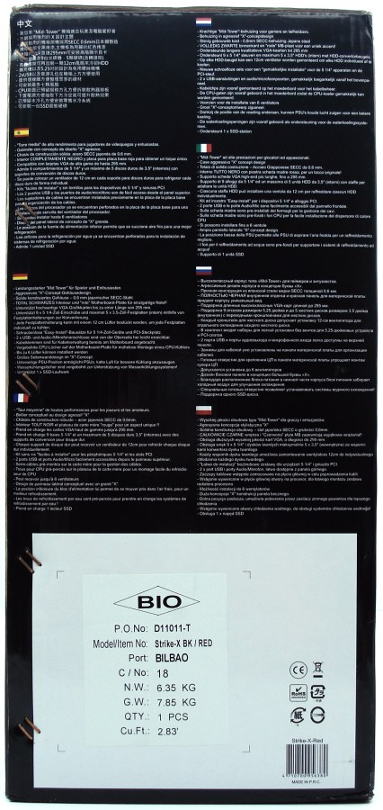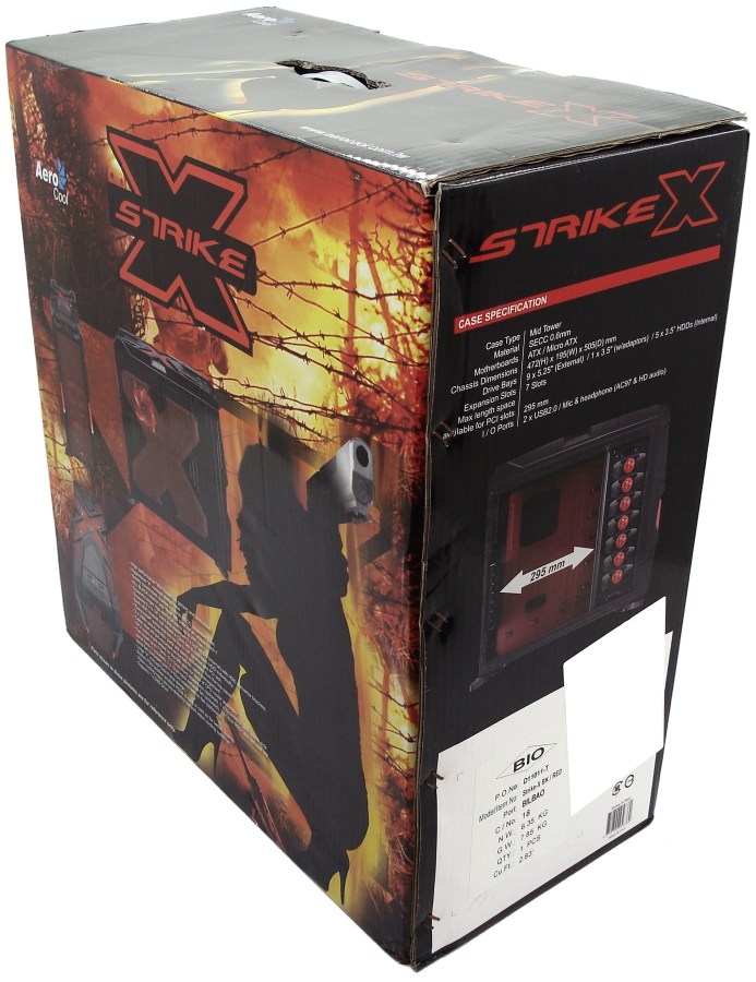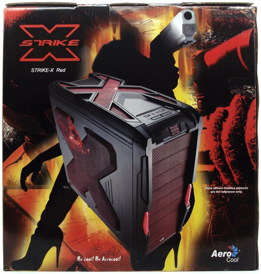 La parte delantera y trasera se nos muestra el motivo de la silueta de una imponente mujer armada con una pistola y en cuyo fondo se adivina a un francotirador en un entorno que nos recuerda al combate de campo. Es evidente hacia dónde está enfocada esta presentación del producto. En la parte frontal vemos una fotografía de la semitorre Strike-X en perspectiva, viendo sus 3 lados más imponentes.