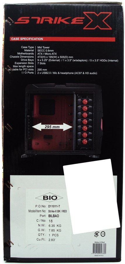 En este otro lateral se limita a mostrarnos el interior de la semitorre junto con un listado de sus especificaciones técnicas. Junto a las dimensiones se debería detallar el peso neto de únicamente la semitorre con todos sus accesorios montados. Lo que más se destaca en la vista lateral es la cabida libre de 295mm para tarjetas PCI/PCIe, siempre y cuando no pongamos unidades en las bahías frontales a esa altura.