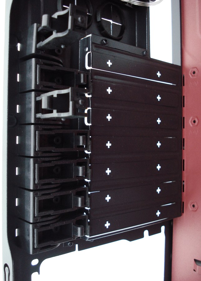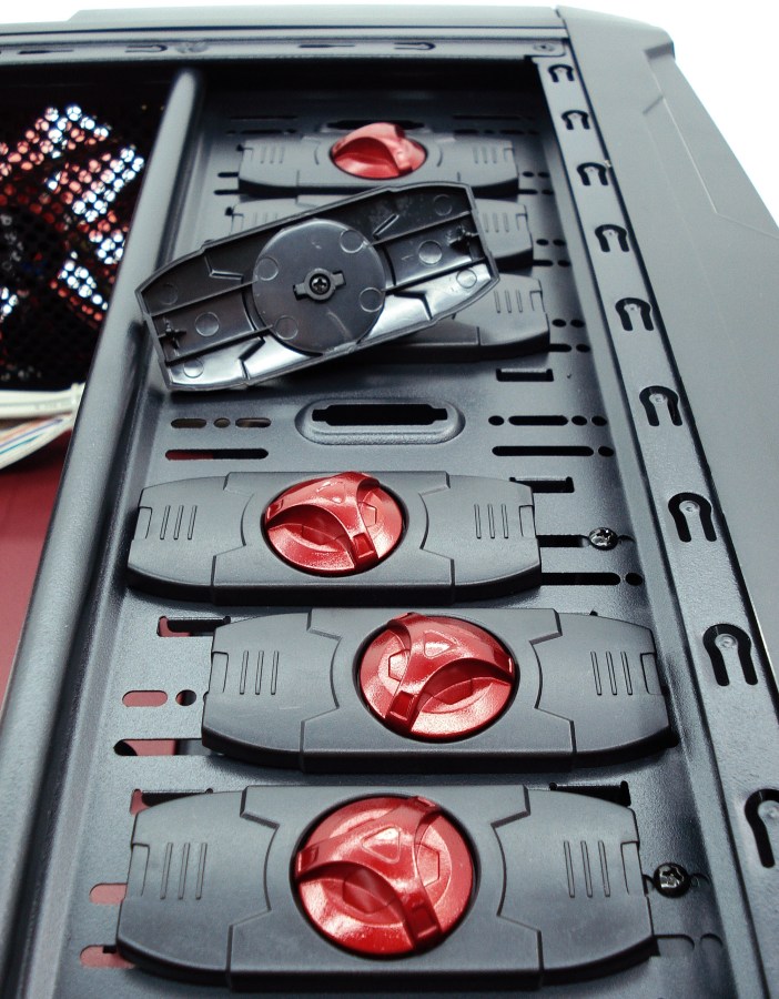 8. AEROCOOL STRIKE-X RED. Detalles Interior II. Sistemas Anclaje sin Tornillos PCI y Bahías Frontales. Refrigeración Activa