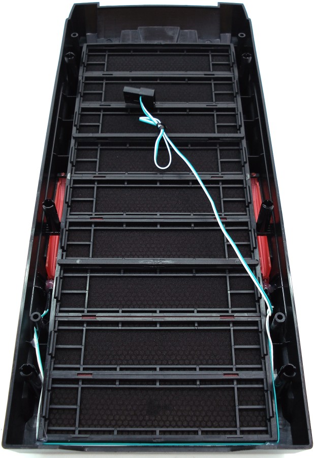 En el reverso del frontal vemos los filtros antipolvo de cada tapa de 5.25″, contruido de material plástico ABS con frontal exterior tipo mesh. Aquí podemos adivinar también el esbelto espacio en anchura que se ha empleado en esta semitorre, de únicamente 18.5cm. Para la iluminación roja del frontal se emplean dos leds empalmados en un mismo cable en Y que va a un molex macho/hembra de 4 pines para su alimentación.