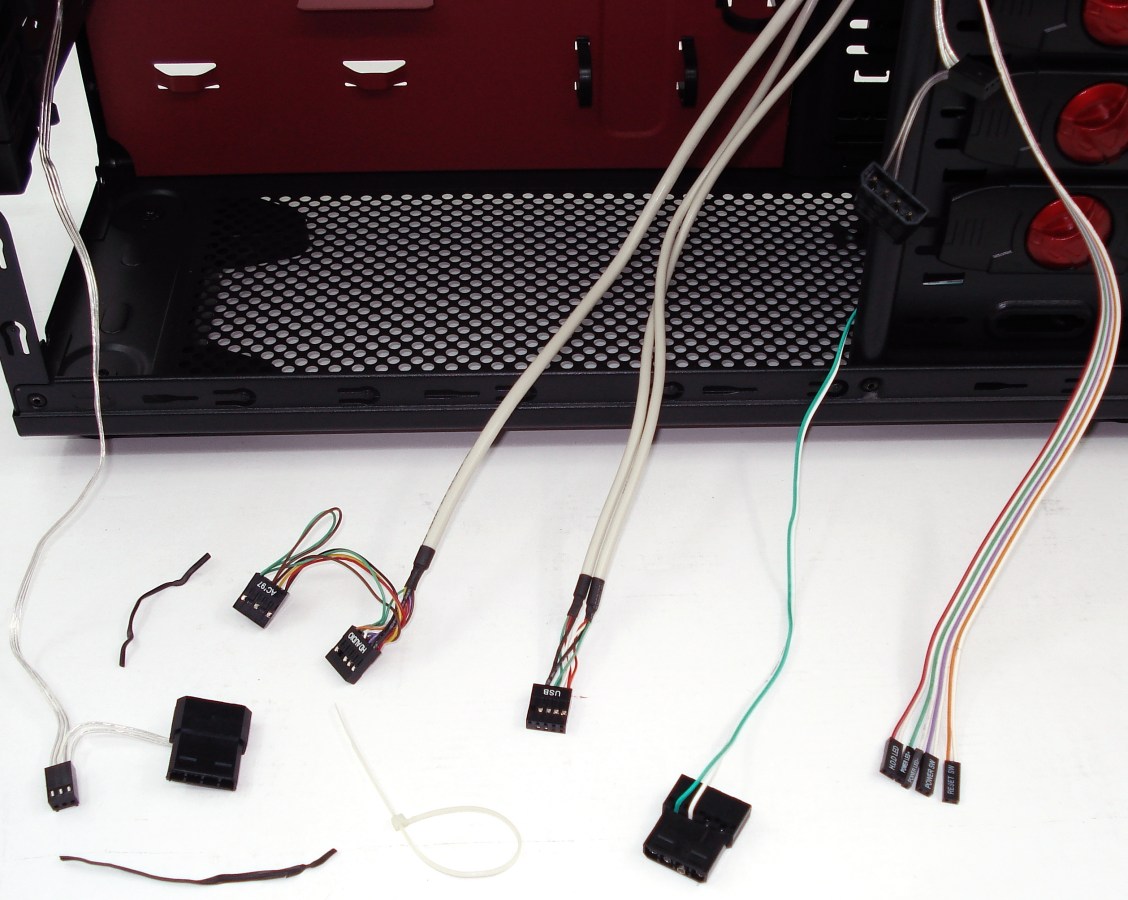 En el apartado de conectividad tenemos cables con longitud bastante generosa. En este caso, no tendremos problemas de conexión por longitud de los mismos. Tendremos los 3 conectores típicos que van al F_Panel de la placa base reunidos en un mismo cableado (todo un acierto), además del cable de audio AC97 y HD Audio, el cable USB 2.0 para conectar dos dispositivos y el cable de alimentación para los 2 LEDs rojos frontales. El cableado de los ventiladores equipados es algo justo en longitud, pero de flexibilidad absoluta en su conexión.
