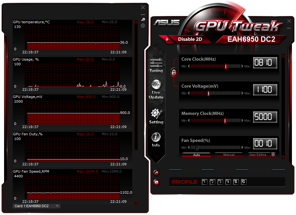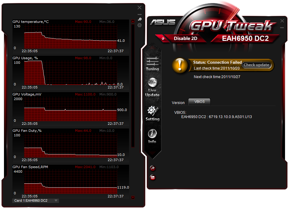 ASUS HD 6950 DIRECTCU II. Captura Utilidad ASUS GPU Tweak v1.10. Sección «Monitoreo» III. Sección «Live Update»