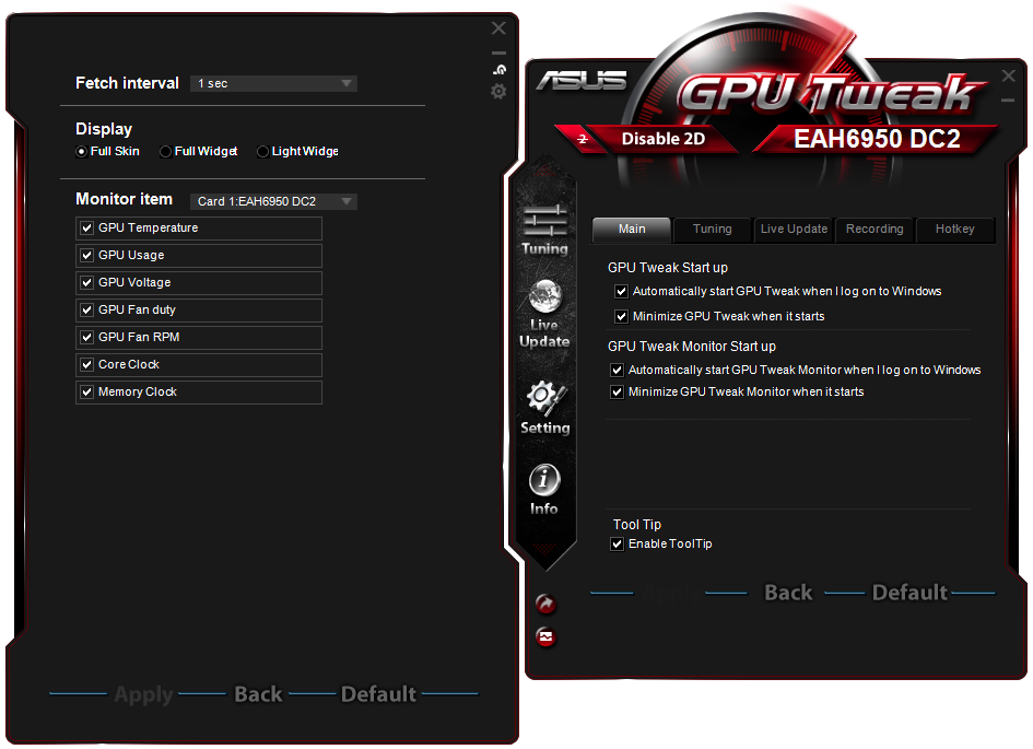 ASUS HD 6950 DIRECTCU II. Captura Utilidad ASUS GPU Tweak v1.10. Sección «Opciones de Monitoreo». Sección «Main»