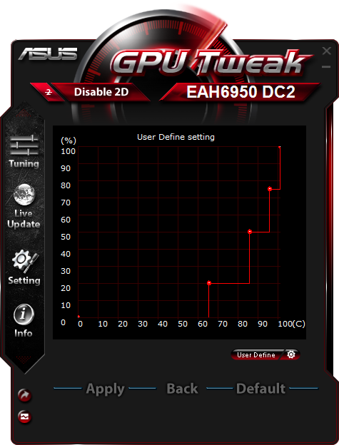 ASUS HD 6950 DIRECTCU II. Captura Utilidad ASUS GPU Tweak v1.10. Sección «FAN User Define Setting»