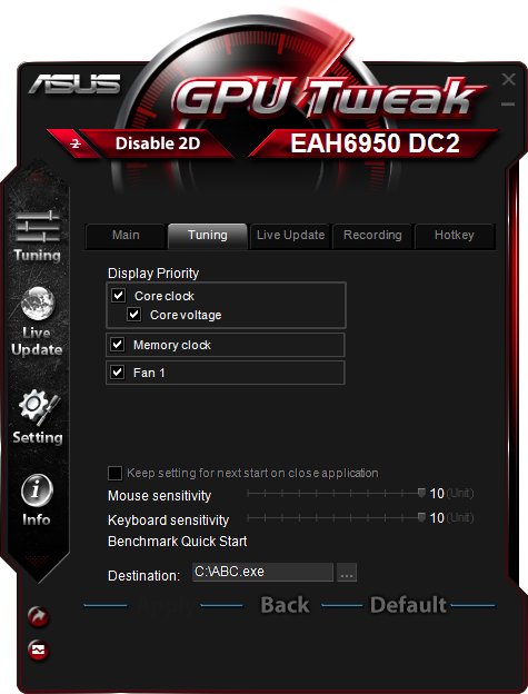 ASUS HD 6950 DIRECTCU II. Captura Utilidad ASUS GPU Tweak v1.10. Sección «Opciones de Tuning»