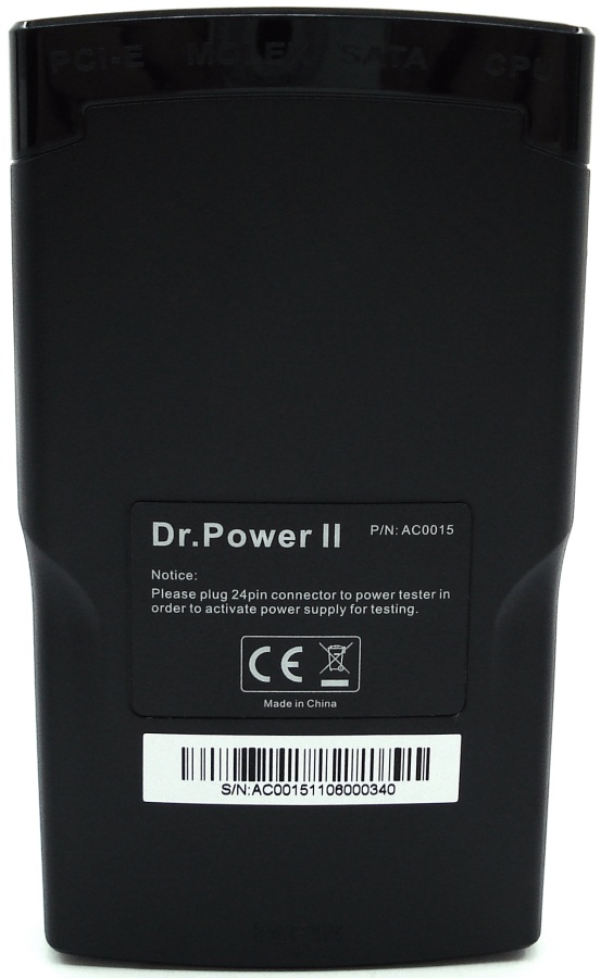 La parte trasera no trae ninguna tapa de acceso a ninguna batería ni nada por el estilo. Este aparato no trae ninguna alimentación en su interior, ya que se alimenta a través de la tensión en modo de espera ofrecida por la fuente de alimentación al cual es conectada, correspondiente a la tensión de corriente continua de +5Vsb. Precisamente al conectar el interruptor de la fuente de alimentación con el téster ya conectado a ella, se encenderá automáticamente. Así nos lo comunica de forma básica la parte trasera a través de una nota en inglés. Tal como también indica, este aparato ha sido fabricado en China, posee el marcado CE y debe ser reciclado cuando queramos deshacernos de él.