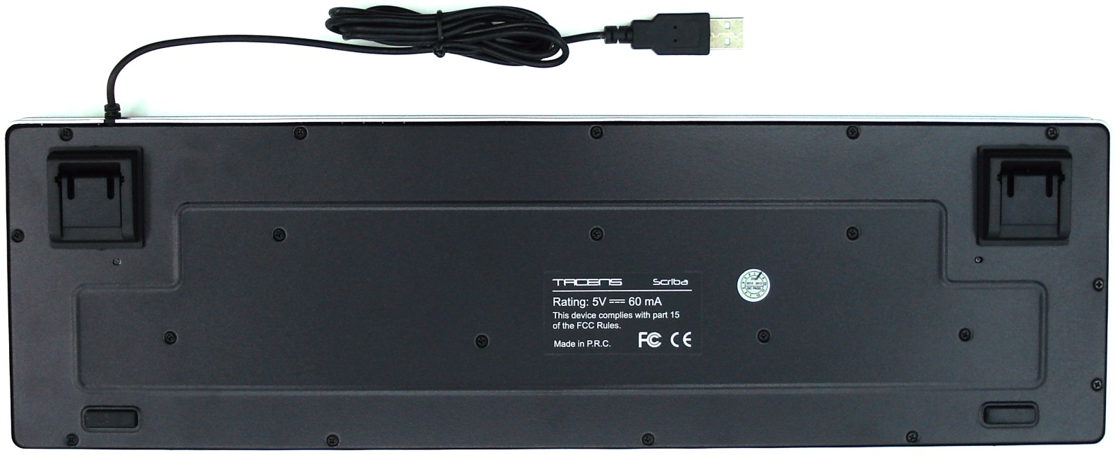 La parte de mayor calidad es la inferior, pese a que parezca absurdo. Completamente enchapada en metal, consigue que el conjunto tenga mayor robustez, ya que la finura del teclado es algo destacable, protegiéndolo a esfuerzos de torsión transversal. Se une a la parte superior de plástico a través de hasta 20 tornillos, repartidos por toda su superficie. Posee 2 patas antideslizantes delanteras, y 2 patas de abatimiento traseras, para inclinar el teclado con cierta pendiente. Siempre debería traer 4 patas antideslizantes como mínimo, aunque ya le gustaría a más de un teclado de gama media tener la base del Scriba.