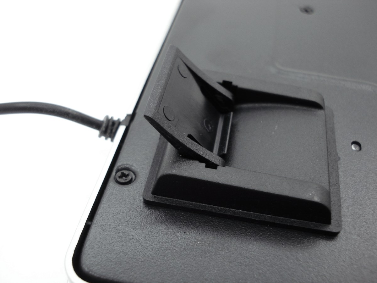 Respecto a las patas delanteras, son de goma adherida a dicha plancha de aproximadamente 20 x 5 mm de superficie de agarre. Con ellas se consigue algo de fricción para que el teclado no se mueva con facilidad sobre cualquier superficie.