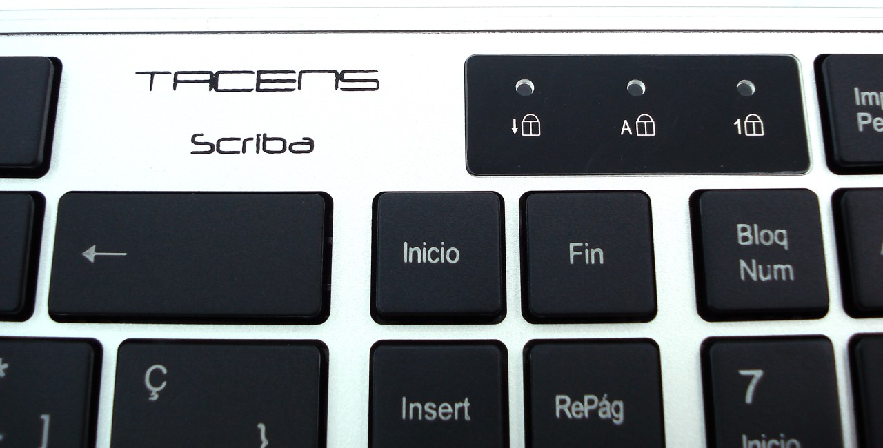 El Scriba dispone de un panel de control muy sencillo, el típico de este tipo de teclados, con hasta 3 LEDs de indicación, correspondientes a las teclas «Num Lock», «Scroll Lock», «Caps Lock». Los LEDs son de color verde, sorprendente elección viniendo de Tacens, cuyo entero acierto hubiera sido equipar al Scriba con 3 LEDs blancos de iluminación media (el blanco siempre ha sido distinción de Tacens; hubiera quedado genial).