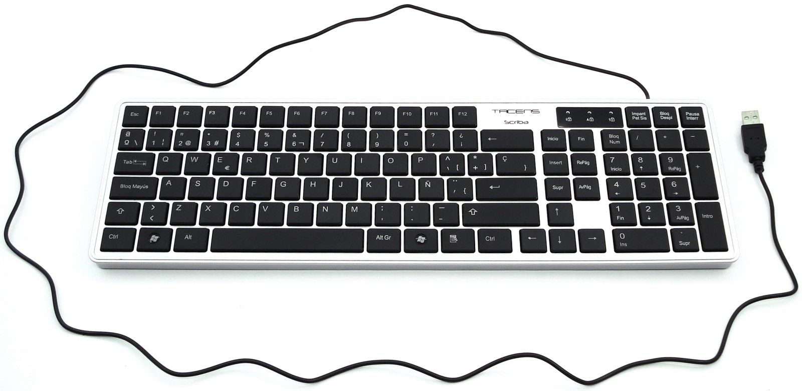 Por último, el cableado del Scriba es bastante fino, seguro en su salida del teclado y bastante resistente. Mide una longitud de 140 cm. Si se supone que se diseña para lugares con poco espacio y que necesitan de un orden especial, su longitud es suficiente. Se alimenta a través del cable USB con sus 5V de tensión, con una intensidad máxima de hasta 60 mA por debajo de la ofrecida por equipos portátiles de reducido tamaño, así que es enteramente compatible con ellos.