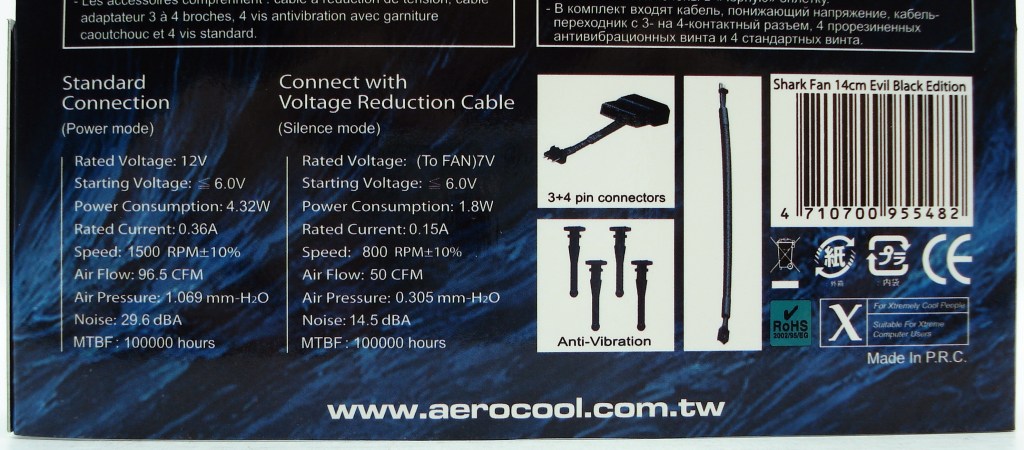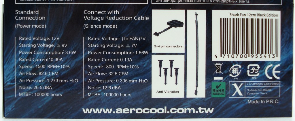 Aquí tenemos todas las características y especificaciones técnicas ya citadas anteriormente bastante bien detalladas. Recorriendo toda la información, solo echamos de menos, como siempre, los años de garantía, que son 2 para cada producto tanto de Aerocool como de Tacens, y el año de producción de todos los modelos, que sabemos que es a finales del 2010 entrando 2011. Todos los productos cumplen con el marcado CE, RoHS, entre otras especificaciones, y deben, como no, ser reciclados tras su vida útil. Estos productos han sido diseñados por Aerocool y Tacens, aunque los Ventus II son una clara herencia de los Shark, todos ellos fabricados en la República Popular China. Por último, cada fabricante nos proporciona su página web oficial respectiva, en la parte más baja del embalaje, por si queremos acceder a mayor información de cada producto.
