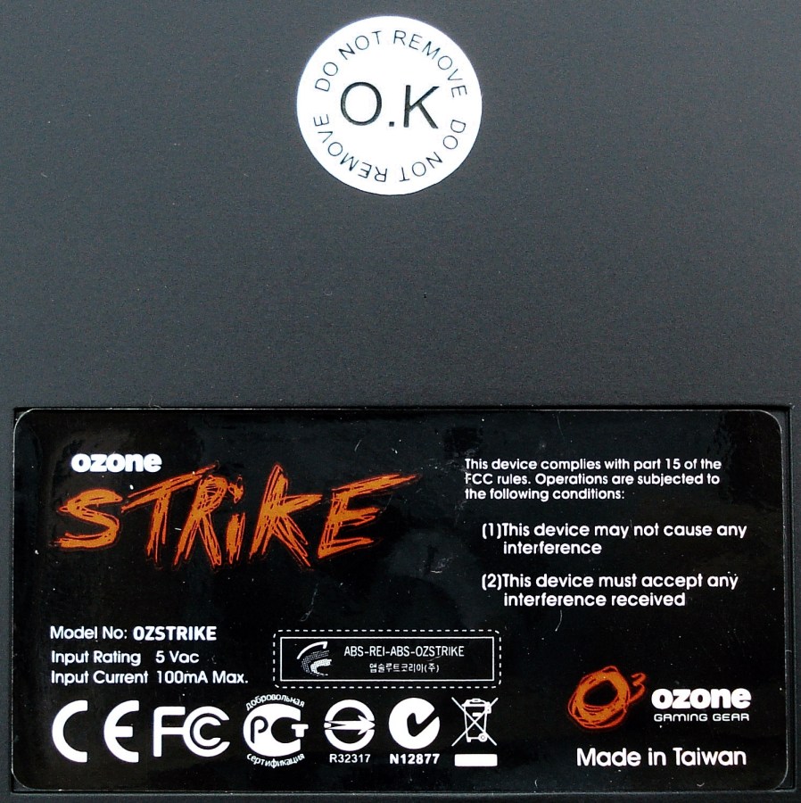 En la parte trasera podemos apreciar la pegatina centrada con el modelo OzStrike, así como la normativa de cumplimiento del producto, con su marcado CE, FCC, etc… Arriba podemos apreciar la pegatina de la garantía, que cubre un tornillo para evitar desmontar el teclado por su parte inferior.