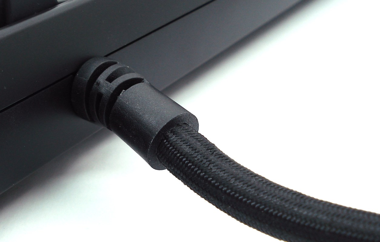 Precisamente para hacer de puente necesita de un cableado conjunto que transmita todas estas funcionalidades. En su saliente dispone de un envolvente bastante rígido que asegura firmemente la unión entre el grueso cable y el teclado. Además, en la ramificación posee otro envolvente rígido que divide el cable grueso de cada cable fino. Estos cables finos van cada uno directamente a los conectores extremos, con una longitud más que suficiente para poder separarlos y conectarlos cada uno a su toma correspondiente de la placa base.
