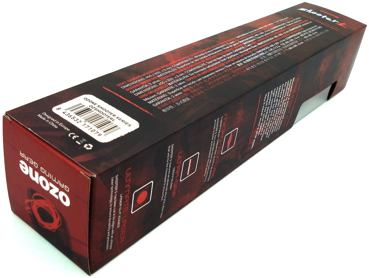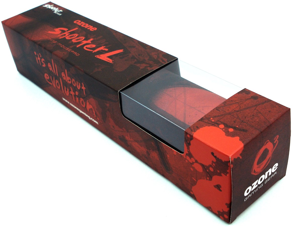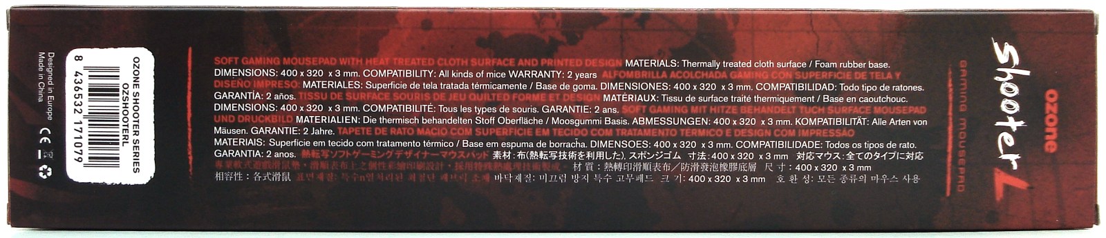 Se detalla el nombre de la marca, modelo, la cita «it’s all about evolution», la web oficial www.ozonegaming.com y una descripción breve pero detallada de las características de esta alfombrilla en hasta 8 idiomas traducidos. Además, se desglosan sus dos tipos de capas, uno de goma de elevado agarre como base y superficie superior de tela de micro textura para mayor deslizamiento, a parte de su trato especial en los cantos y todo el recorrido perimetral, entre la unión de la tela con la goma tratado con un tratamiento láser especial para garantizar su durabilidad.