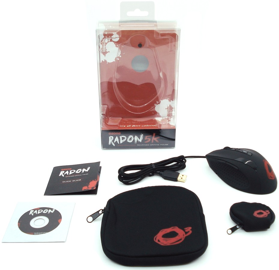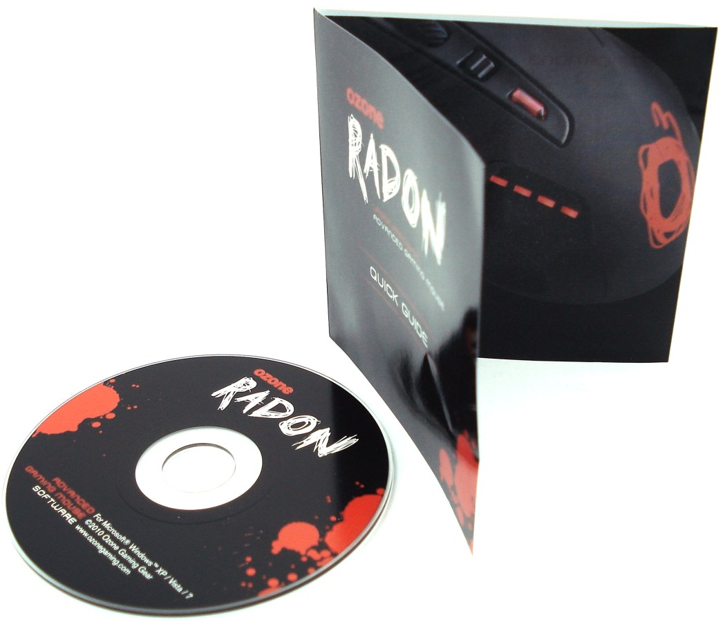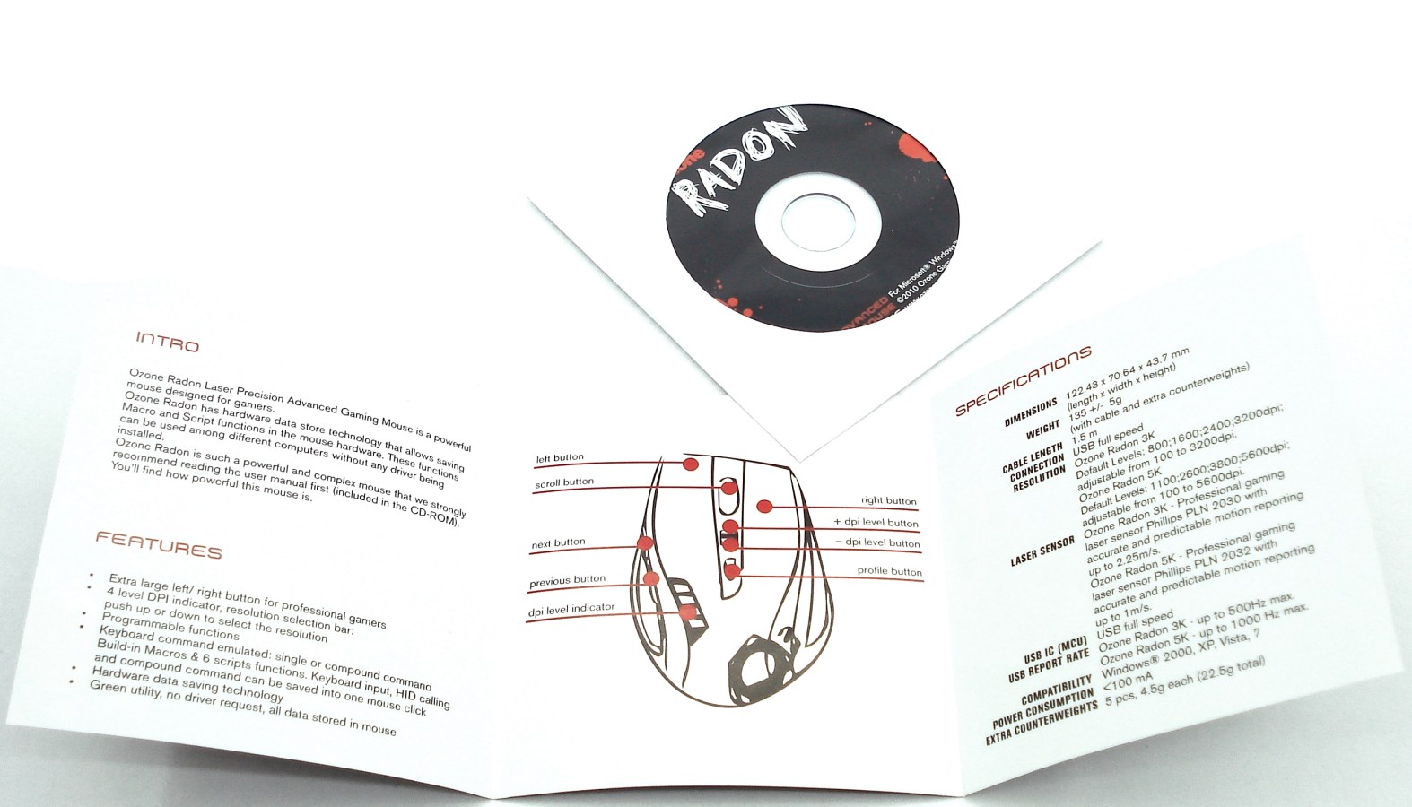 La guía está únicamente en inglés, y detalla una introducción al ratón, sus características y sus especificaciones, a la vez que muestra un esquema básico del ratón con todas sus funciones. El CD de instalación tan solo contiene el ejecutable «Ozone_Radon.exe» que no necesita de instalación, y cuatro manuales mucho más completos y por separado en formato PDF, en inglés, portugués, inglés y chino, válidos también para el modelo Radon 3K.
