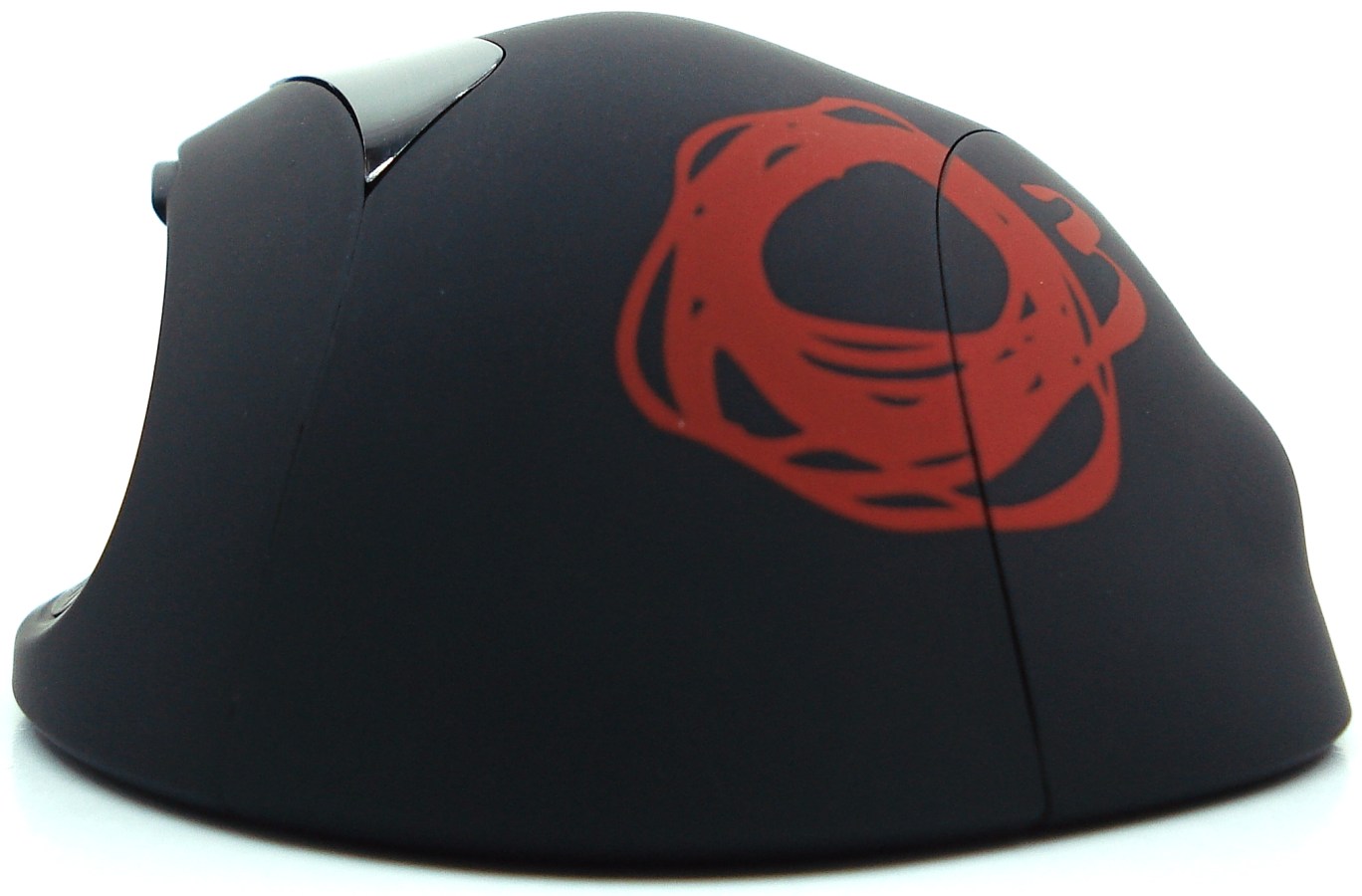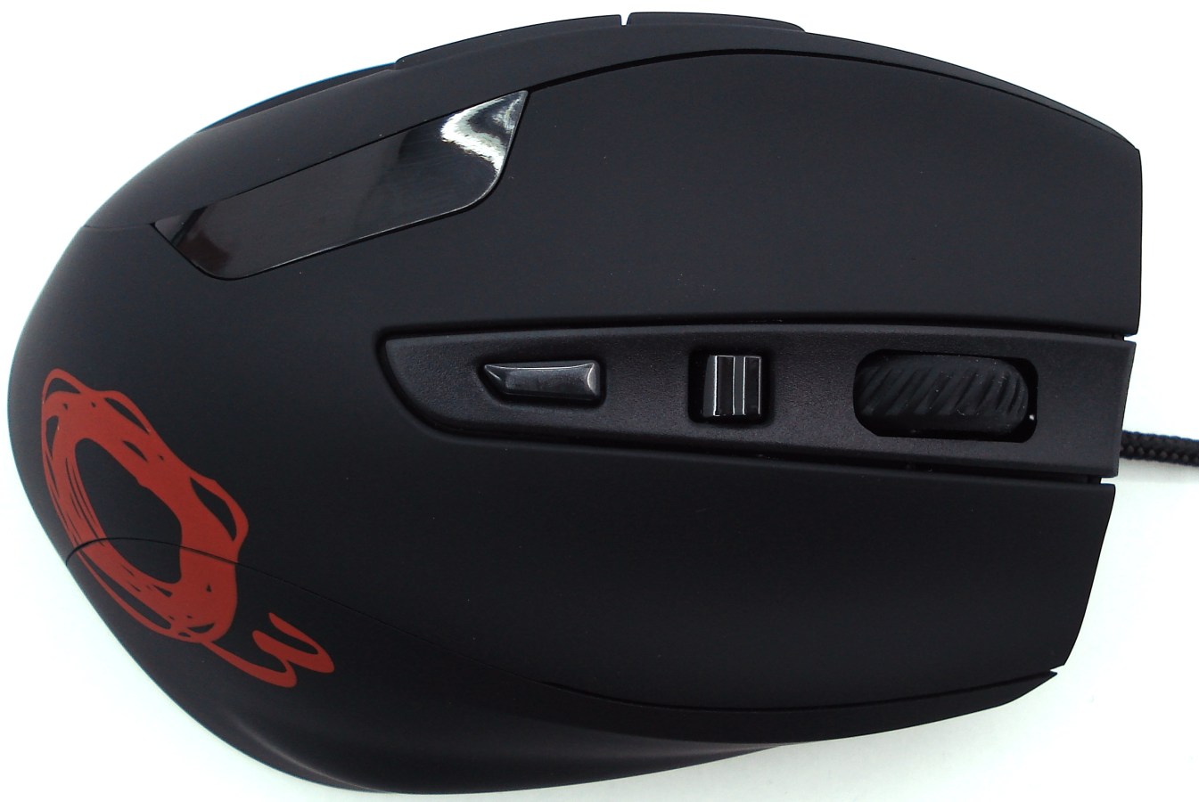 La parte envolvente superior está dividida en 4 zonas, las 2 laterales destinadas a su ergonomía para mejor agarre y apoyo de los dedos extremos, los botones derecho e izquierdo de gran formato, la columna central con 5 funciones a través de 3 dispositivos (botón, interruptor autoabatible de doble posicionamiento y rueda giratoria/botón central), y por último su ventana de LEDs rojos intentando cubrir la zona que deja la mano descubierta comprendida entre el dedo pulgar e índice.
