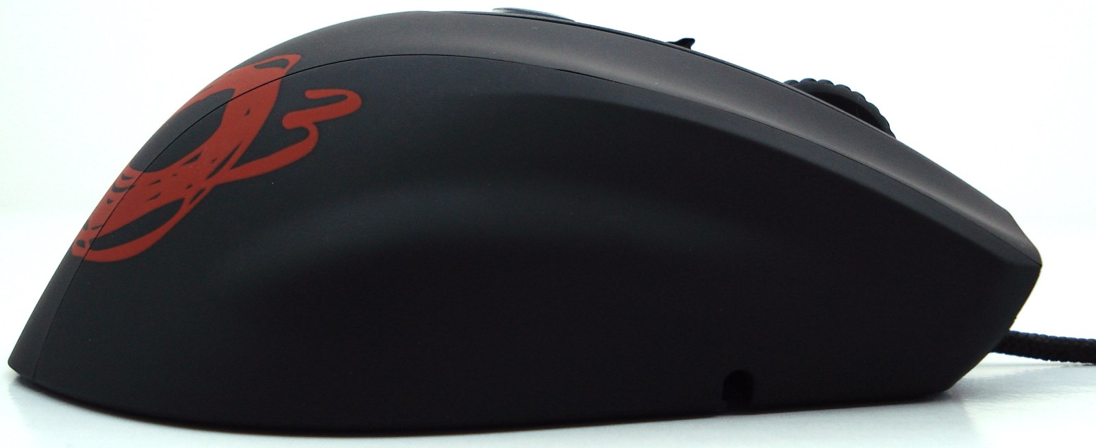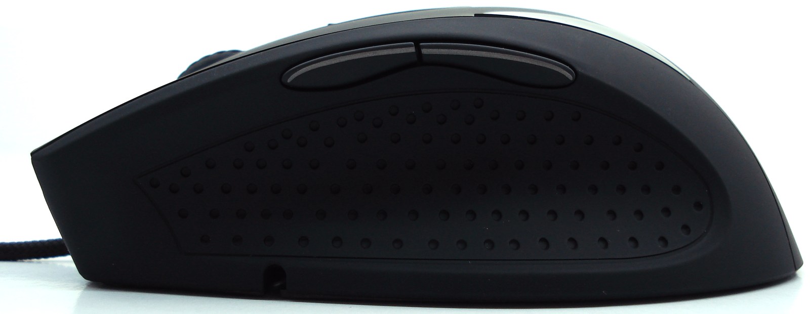 Los laterales normalmente se emplean para conseguir facilitar el agarre del ratón para levantarlo y mayor acople de la mano para apoyarse en él cómodamente. Tal como podemos ver, la zona izquierda conserva los típicos botones con función «siguiente» y «atrás» y un recubrimiento especial de goma granulada para asentar ahí el dedo pulgar. En cambio la zona derecha ha sido la zona más olvidada del ratón limitándose a una ligera doble línea de trazado para los dedos meñique y anular…