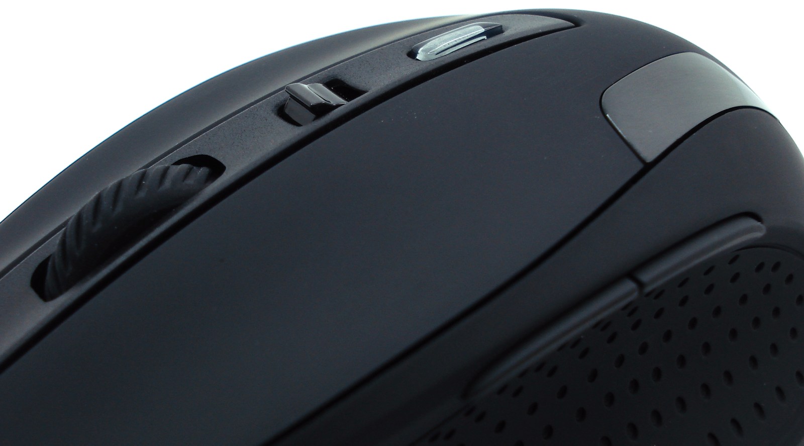 El primer detalle está relacionado al acabado superior del ratón. En tal acabado se emplean 3 materiales, plástico ABS, capa de forro superficial para contacto, y goma en el lateral y en la rueda giratoria. Dispone de las 8 funciones accesibles a través de botones y la rueda listadas anteriormente. El resto lo conforman el LED de triple color y los 4 LEDs rojos para indicación de la precisión. El material de mayor desgaste, inevitablemente será la capa fina de forro superficial que le caracteriza al plástico de un tacto similar a la goma de pulido suave.