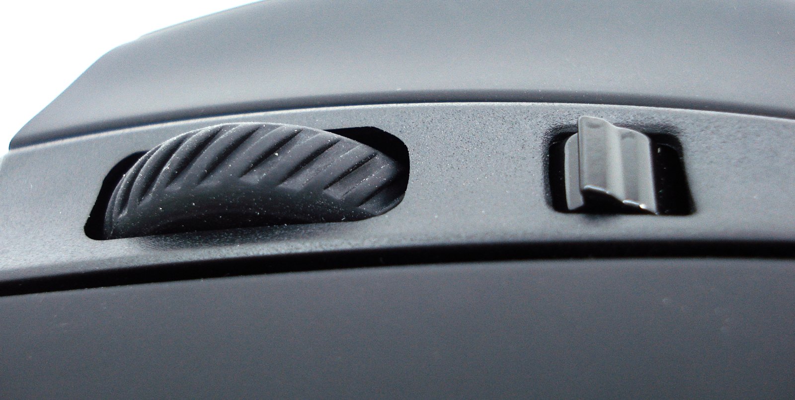 Los dos mecanismos que más llaman la atención son la rueda giratoria y su acabado con superficie rebanada de goma (izquierda fotografía superior), y su interruptor de doble posición autoabatible (derecha fotografía superior). Ambos dispositivos están colocados en la zona centrada de mejor retranqueo para mejorar su acceso. No obstante, el botón de cambio de perfil está algo más hacia la zona posterior del lomo y resulta algo más elaborado de pulsar, como es lógico, ya que este botón será el que menos empleemos.