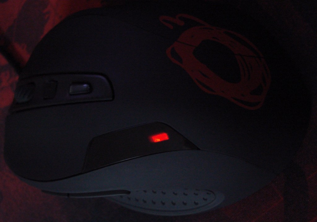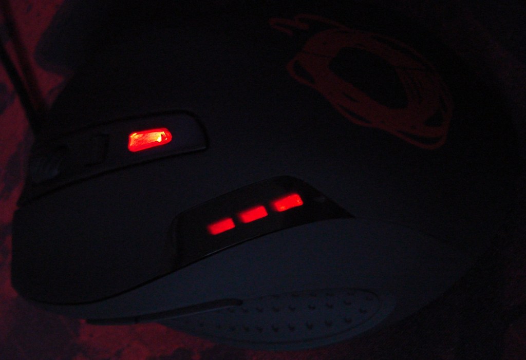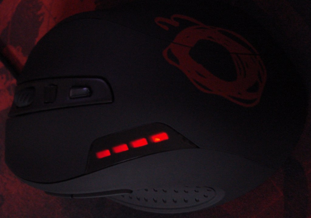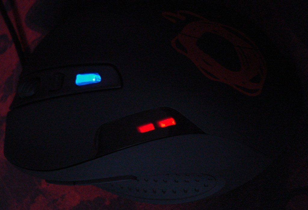 Tal como podemos ver en la tira de imágenes superior, tenemos una doble información aportada por la columna de 4 LEDs rojos que indican el nivel de DPI que estamos usando de sus 4 velocidades posibles (velocidad 1, un LED encendido, velocidad 2, dos LEDs encendidos, etc…) y el botón con LED de triple iluminación, azul, roja y magenta. Así que además de sus 8 mecanismos de pulsación tenemos una doble pantalla de iluminación a través de LEDs claramente identificados y colocados en las zonas más adecuadas para un acceso visual directo, sin que la mano estorbe demasiado al manejar el ratón.