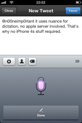 No obstante, mientras los hackers se dedican a tratar de llevar Siri a otros iDevices, un desarrollador ha logrado lanzar una aplicación a la tienda Cydia, llamada Siri0us, la cual hace uso del sistema Siri Dictation por lo que esta permite activar el grandioso sistema de reconocimiento de voz y así el iPhone escribirá todo lo que el usuario le dicte, con tan solo presionar el botón de Siri que estará ubicado al lado de la barra de espacio en el teclado del iPhone.