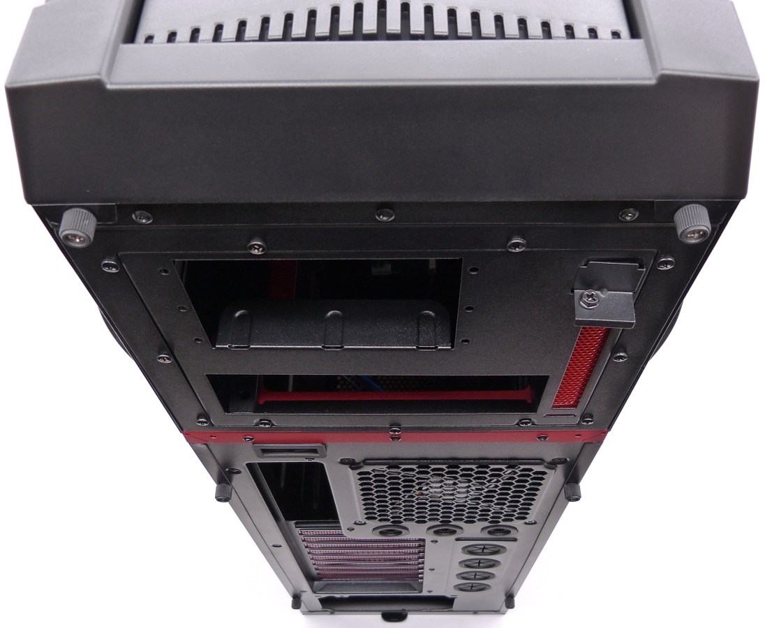 Otro inconveniente en cuanto a refrigeración liquida es la tapa extraíble de arriba del todo. En mi opinión hubiera sido mejor poner una rejilla perforada metálica mejor que la tapa da plástico con la abertura de aletas que no permiten una entrada de aire en condiciones. Además para temas de modding quedaría muy bien con ventiladores con Leds.