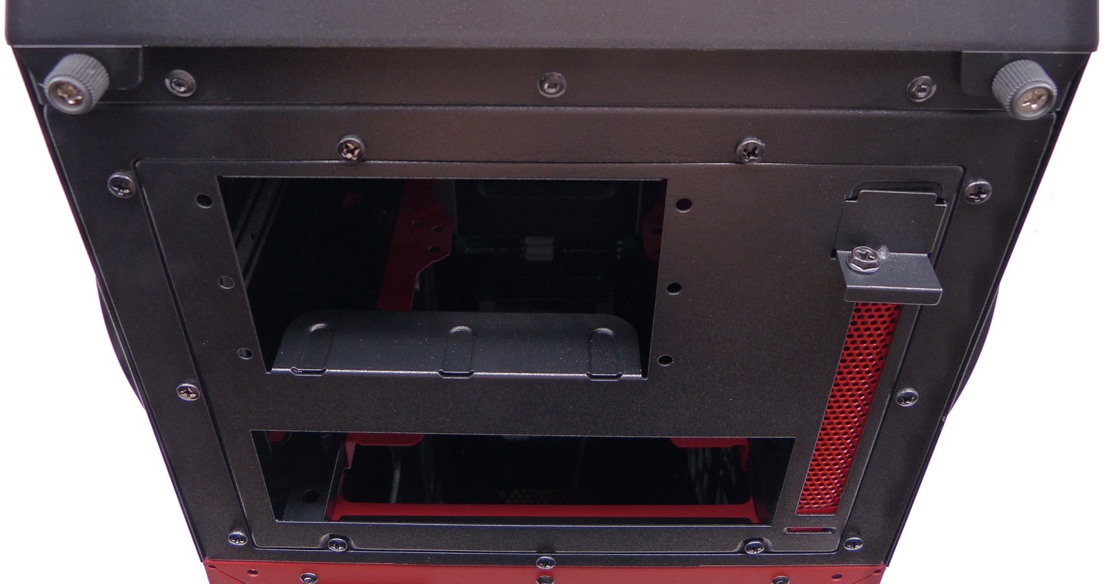 La trasera del módulo superior tiene un marco de metal armado con 9 tornillos, que consiguen coser dicho marco en todo el perímetro. No permite el giro de 180º, siendo la posición que se muestra en la fotografía superior la fijada. Dicho marco se puede sustituir por los otros 2 que hemos visto anteriormente, que vienen adjuntos en la caja de cartón de accesorios. Este marco en concreto tiene dos perforaciones cuadradas para una fuente de alimentación de formato SFX y la apertura para la trasera de una placa base micro-ATX mini-ITX, con una placa trasera PCI microperforada.