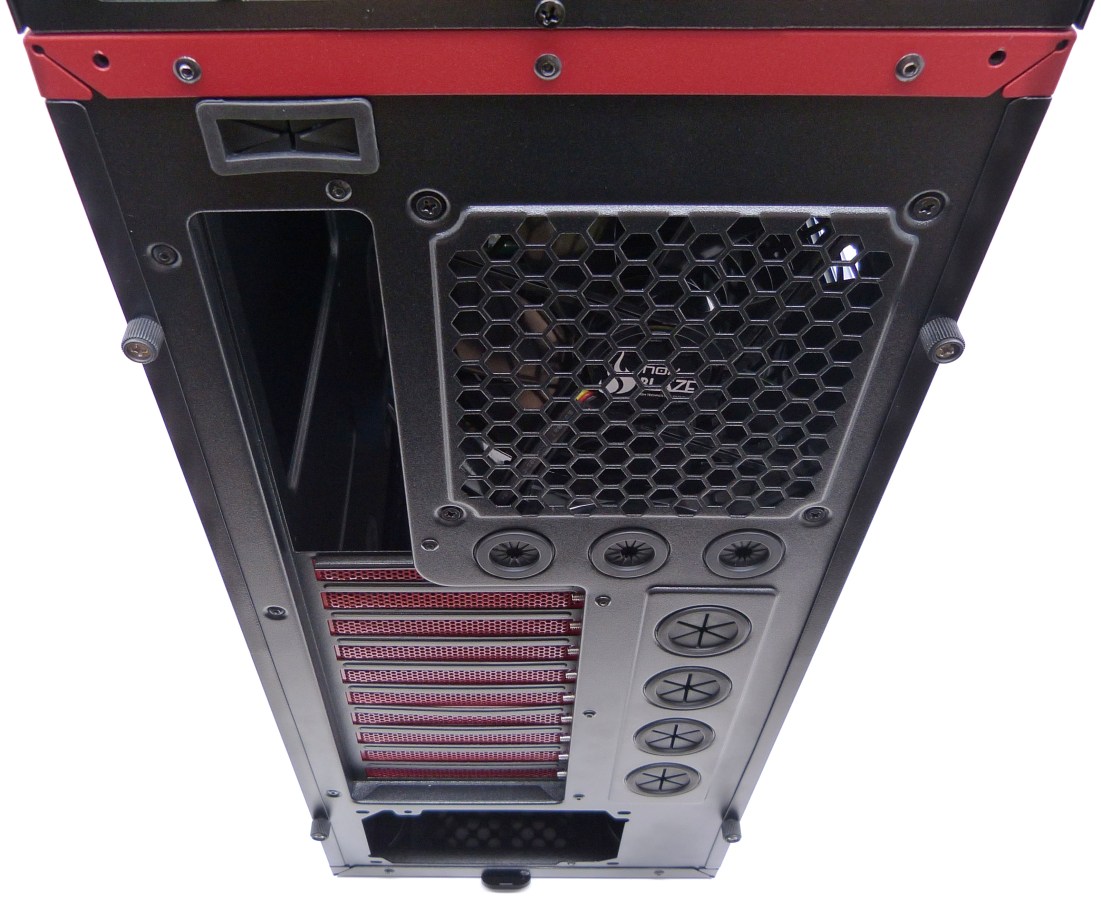 La trasera del módulo inferior es muy similar a las típicas traseras de semitorres del mercado actual, salvo por algún pequeño detalle. La gran diferencia es que posee 4 pasatubos verticales y 3 horizontales con protecciones circulares de goma. Además, en la parte superior, posee un pasa cables, también protegido con una protección de goma rectangular, para extraer el cable USB 3.0 y conectarlo en el panel trasero de la placa base. Parece mucho más acertado esta opción, que el equipar una placa PCI con una perforación para extraer el cable. El resto está equipado con un ventilador de extracción de 12cm sin LEDs y 10 placas metálicas microperforadas PCI, pintadas en rojo.