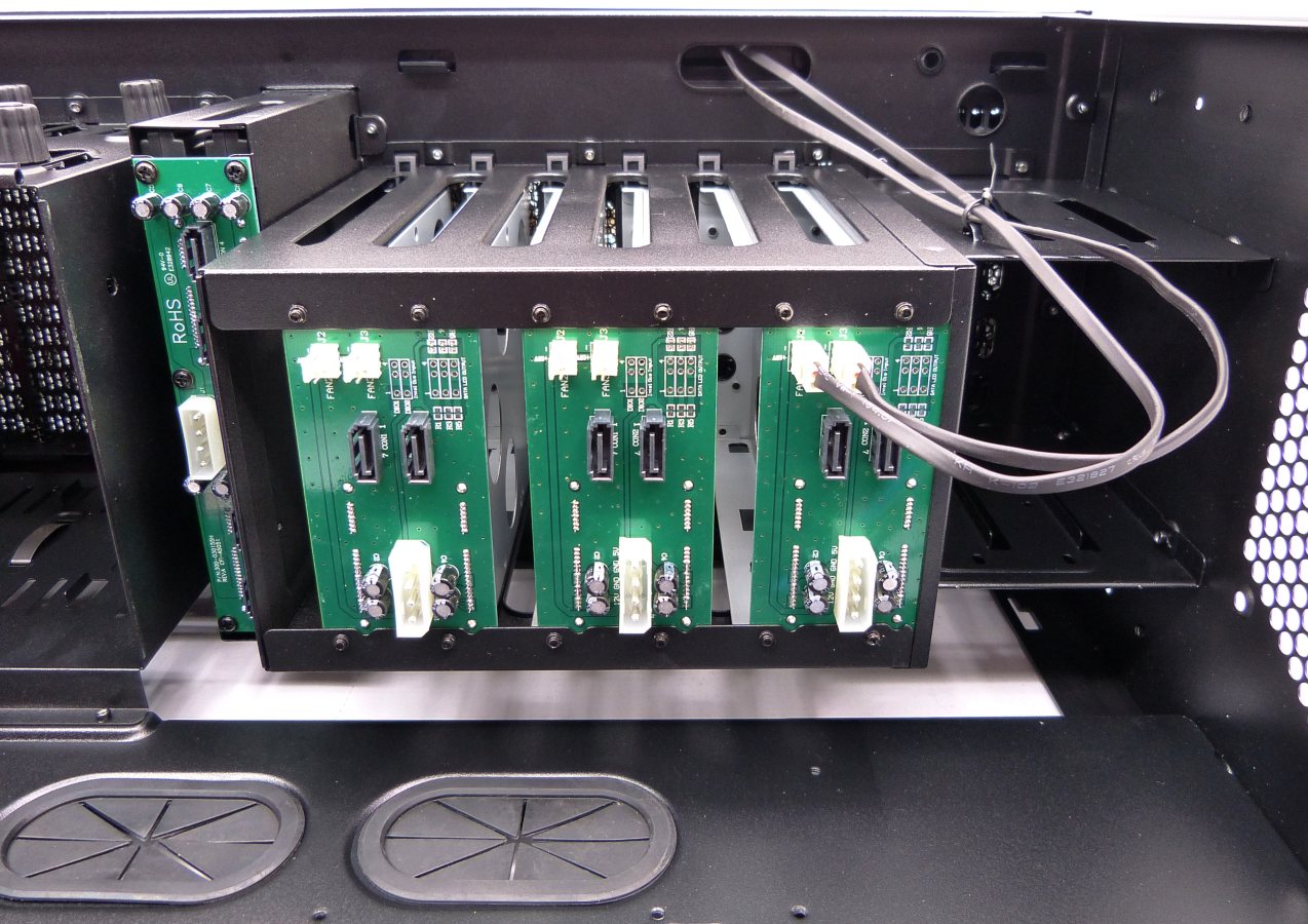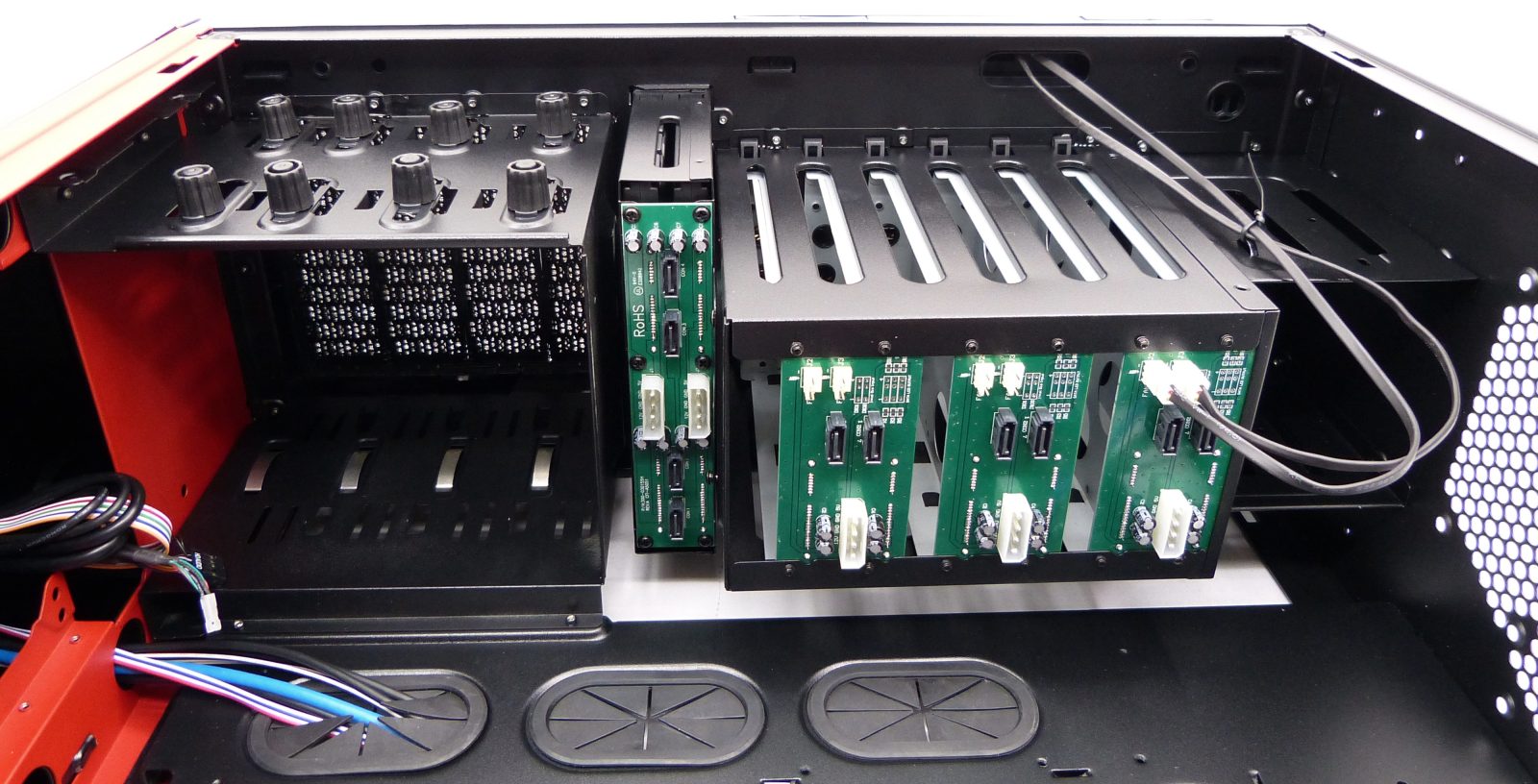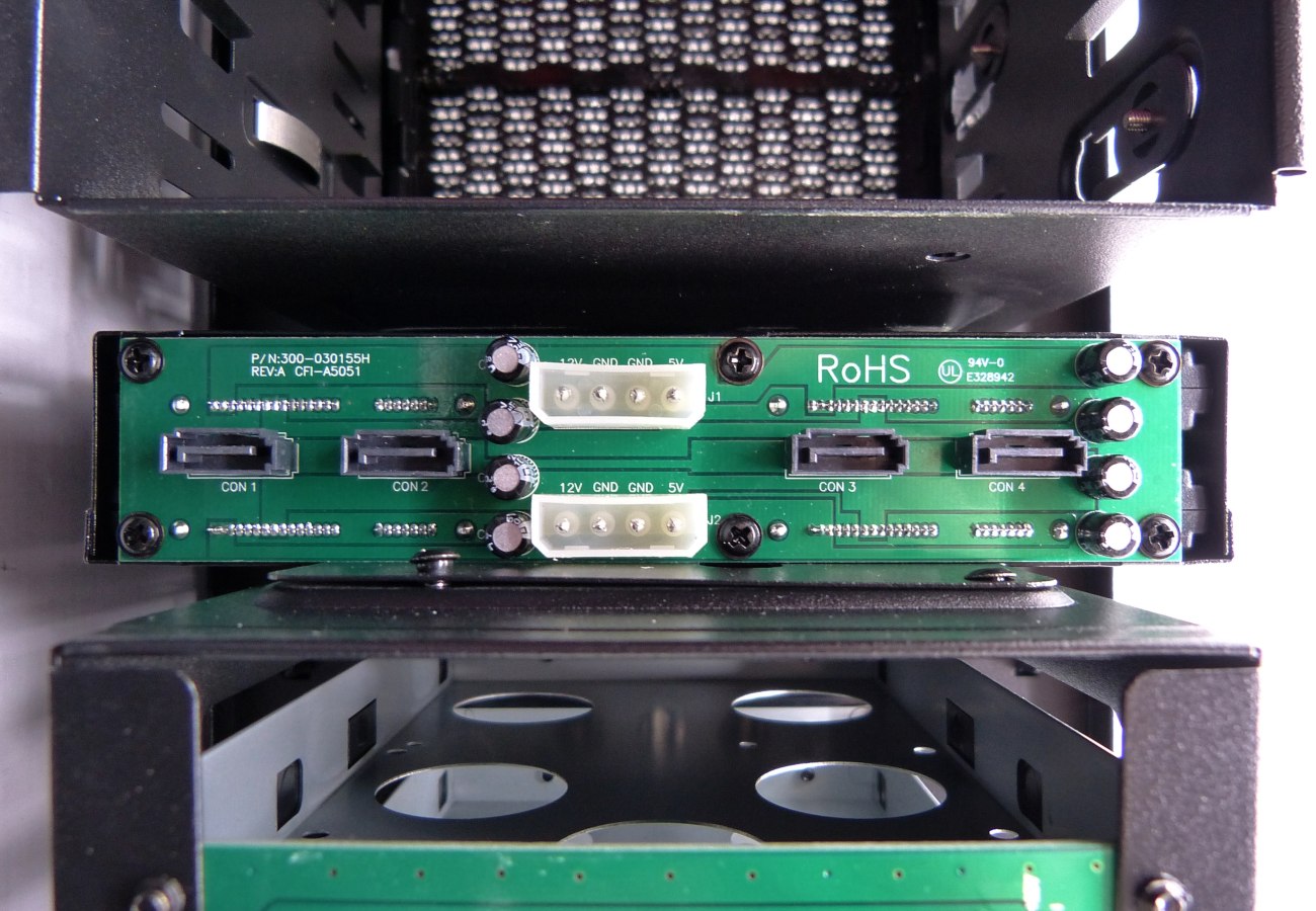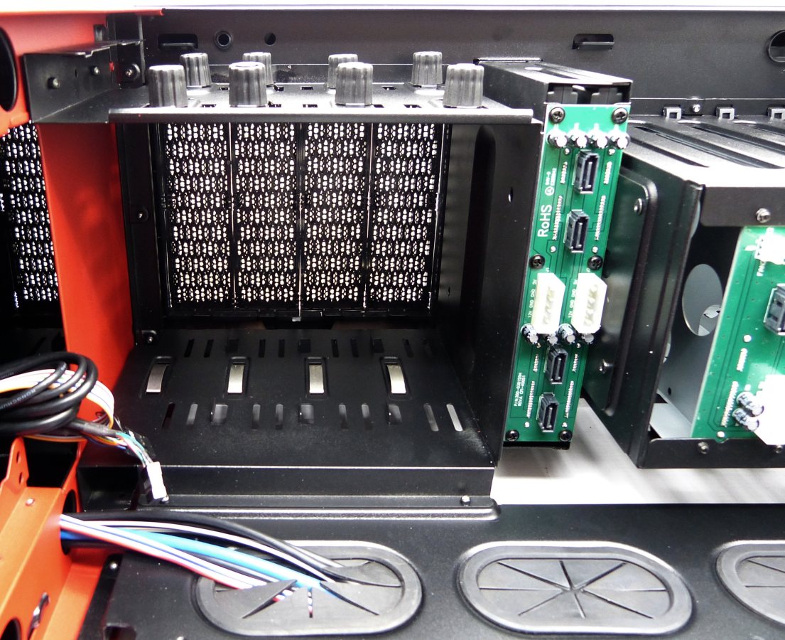 La sección inferior además también se aprovecha para poder equipar fijos hasta 3 HDD (discos duros) más de 3.5″, éstos sin emplear el sistema «Easy Swap» (no son accesibles a través del frontal).