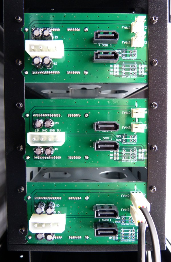 Las 3 placas restantes son de mayor tamaño que la anterior, iguales entre sí, con un molex de 4 pines y 2 entradas SATA para 2 unidades de disco duro cada una. Además, vienen equipadas con 2 conectores de 3 pines macho de alimentación de corriente continua para un ventilador con conector de 3 pines (con tensión de +12V y neutro). En este caso, la función de detección de las RPM correspondiente al cable amarillo queda inhabilitada. Esto significa que no podremos controlar de forma directa todos los ventiladores conectados a dichas placas.