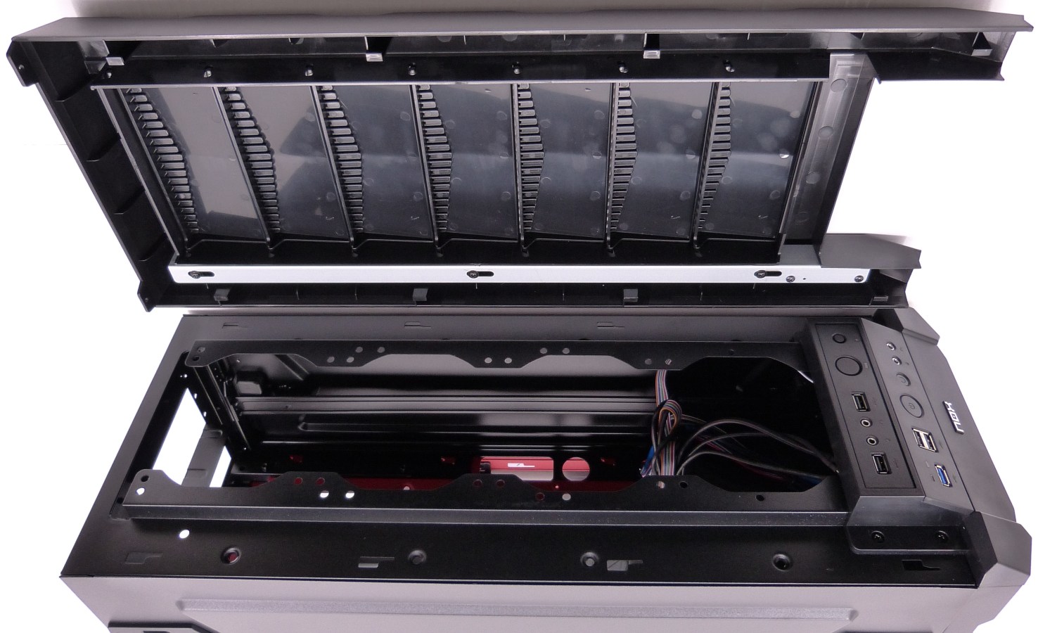 Otro inconveniente en cuanto a refrigeración liquida es la tapa extraíble de arriba del todo. En mi opinión hubiera sido mejor poner una rejilla perforada metálica mejor que la tapa da plástico con la abertura de aletas que no permiten una entrada de aire en condiciones. Además para temas de modding quedaría muy bien con ventiladores con Leds.